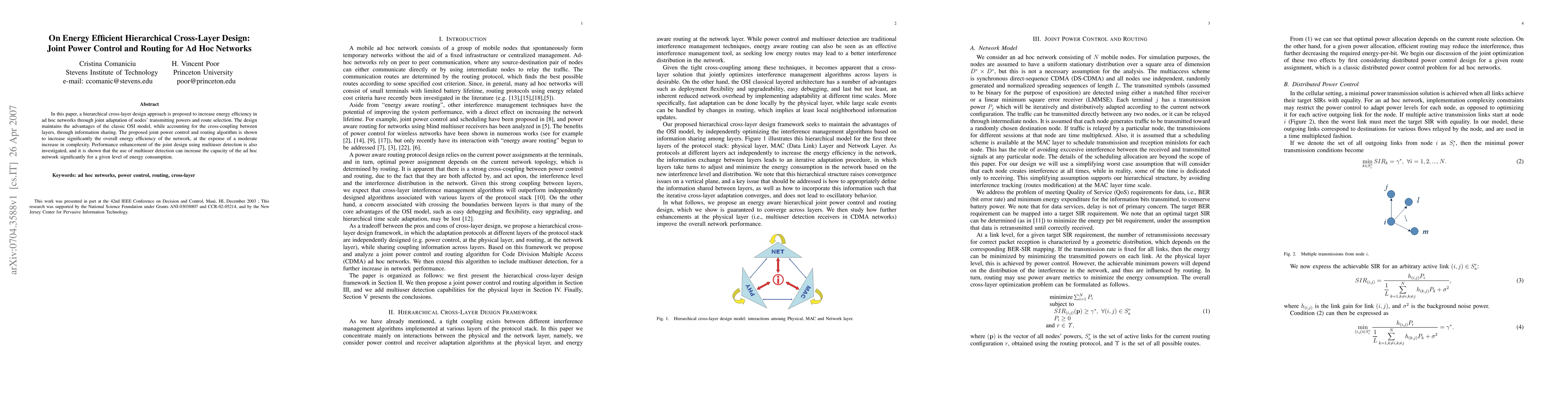 This paper proposes a hierarchical cross-layer design for enhancing energy efficiency in ad hoc networks by jointly optimizing power control and routing. The approach leverages information sharing across layers to improve overall energy efficiency, with a moderate increase in complexity, and demonstrates significant capacity gains using multiuser detection.