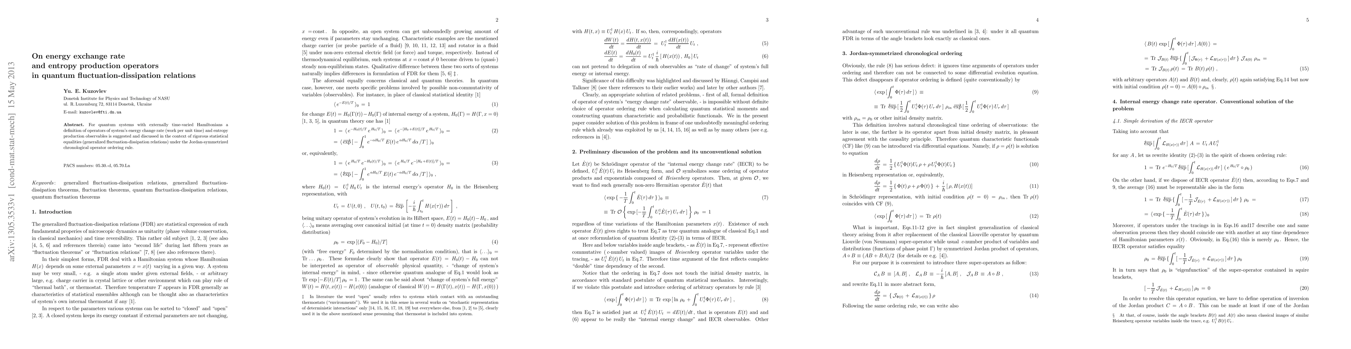 This paper introduces operators for energy change rate and entropy production in quantum systems with time-varying Hamiltonians. It explores these concepts through generalized fluctuation-dissipation relations under the Jordan-symmetrized chronological operator ordering rule.