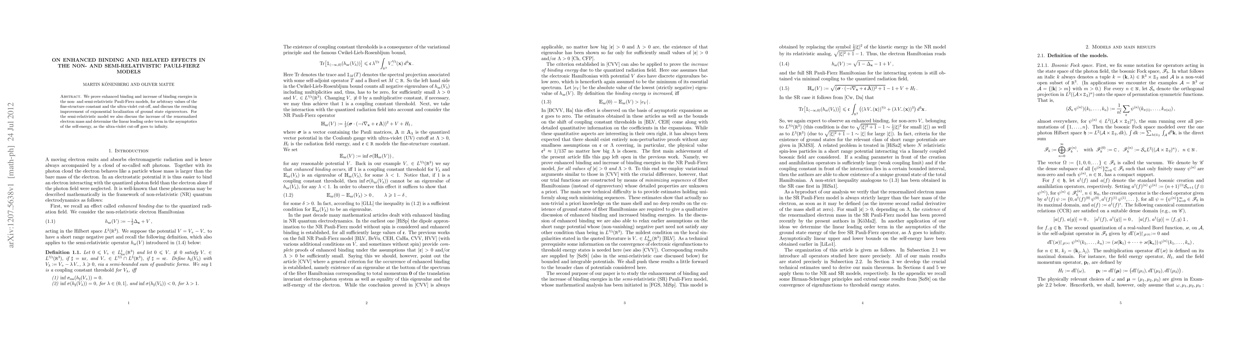 This paper demonstrates enhanced binding and increased binding energies in non- and semi-relativistic Pauli-Fierz models, showing improved exponential localization of ground state eigenvectors. It also discusses the rise in the renormalized electron mass and determines the leading order term in the self-energy's asymptotic behavior as the ultra-violet cut-off approaches infinity.