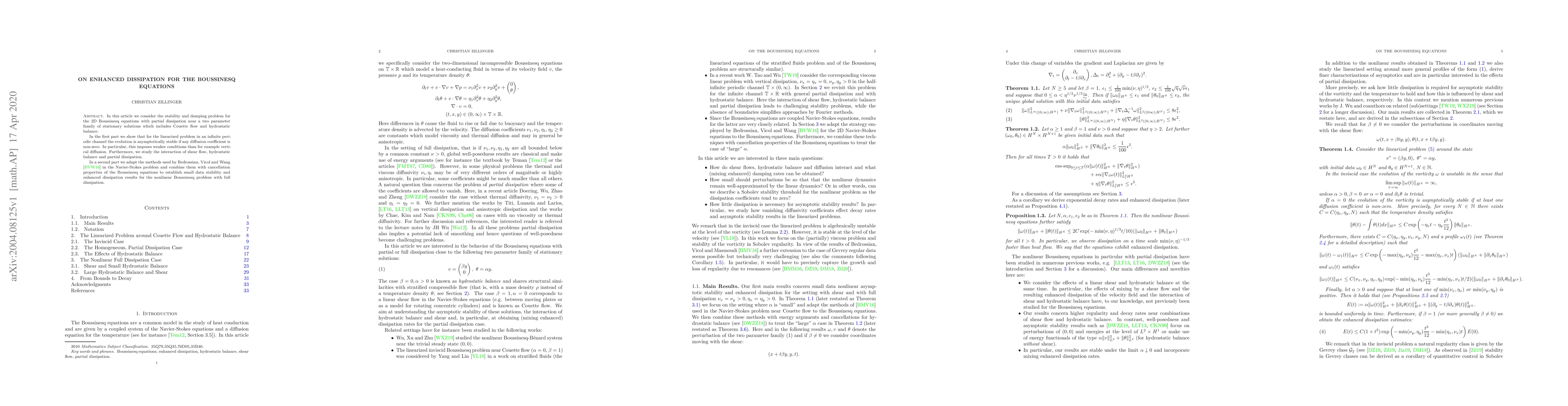 This paper investigates the stability and damping of the 2D Boussinesq equations with partial dissipation, proving asymptotic stability for linearized problems in an infinite periodic channel with any non-zero diffusion coefficient. The study also establishes small data stability and enhanced dissipation for the nonlinear Boussinesq problem with full dissipation, adapting methods from the Navier-Stokes problem.