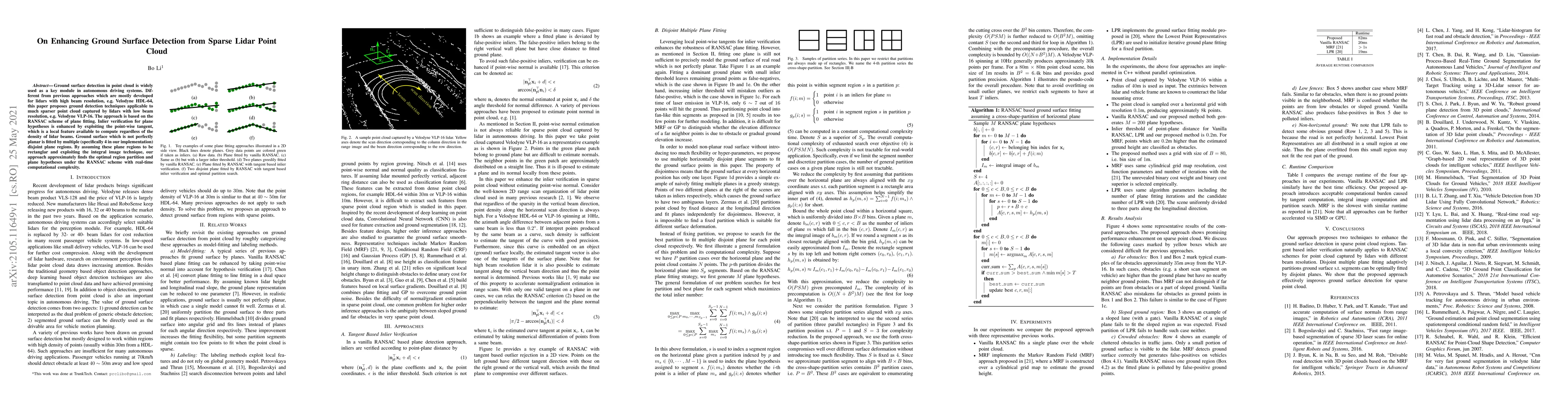 Ground surface detection in point cloud is widely used as a key module in autonomous driving systems. Different from previous approaches which are mostly developed for lidars with high beam resolution, e.g. Velodyne HDL-64, this paper proposes ground detection techniques applicable to much sparser point cloud captured by lidars with low beam resolution, e.g. Velodyne VLP-16. The approach is based on the RANSAC scheme of plane fitting. Inlier verification for plane hypotheses is enhanced by exploiting the point-wise tangent, which is a local feature available to compute regardless of the density of lidar beams. Ground surface which is not perfectly planar is fitted by multiple (specifically 4 in our implementation) disjoint plane regions. By assuming these plane regions to be rectanglar and exploiting the integral image technique, our approach approximately finds the optimal region partition and plane hypotheses under the RANSAC scheme with real-time computational complexity.