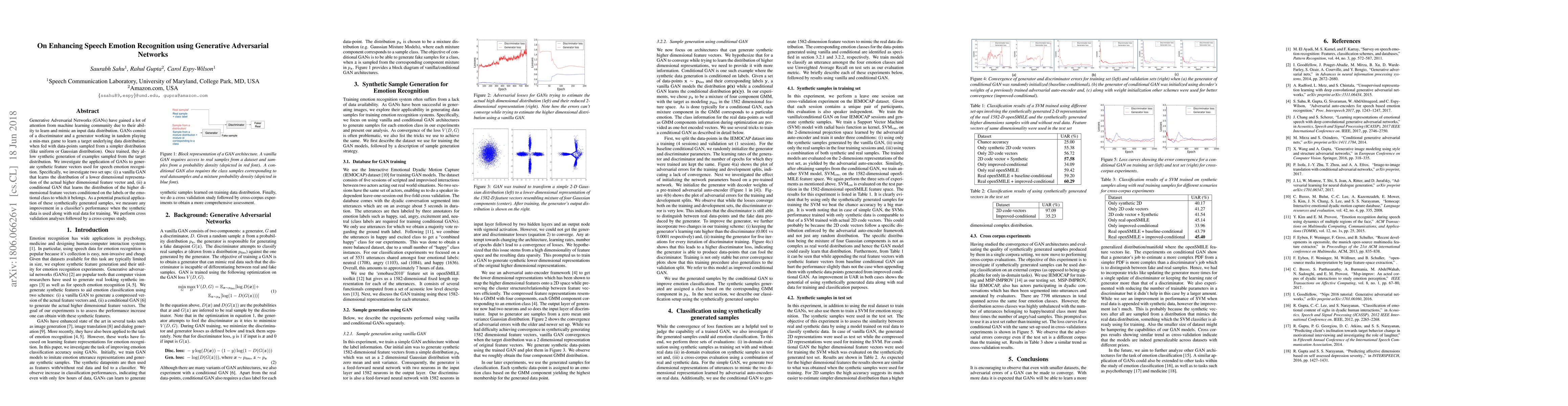 Generative Adversarial Networks (GANs) have gained a lot of attention from machine learning community due to their ability to learn and mimic an input data distribution. GANs consist of a discriminator and a generator working in tandem playing a min-max game to learn a target underlying data distribution; when fed with data-points sampled from a simpler distribution (like uniform or Gaussian distribution). Once trained, they allow synthetic generation of examples sampled from the target distribution. We investigate the application of GANs to generate synthetic feature vectors used for speech emotion recognition. Specifically, we investigate two set ups: (i) a vanilla GAN that learns the distribution of a lower dimensional representation of the actual higher dimensional feature vector and, (ii) a conditional GAN that learns the distribution of the higher dimensional feature vectors conditioned on the labels or the emotional class to which it belongs. As a potential practical application of these synthetically generated samples, we measure any improvement in a classifier's performance when the synthetic data is used along with real data for training. We perform cross-validation analyses followed by a cross-corpus study.