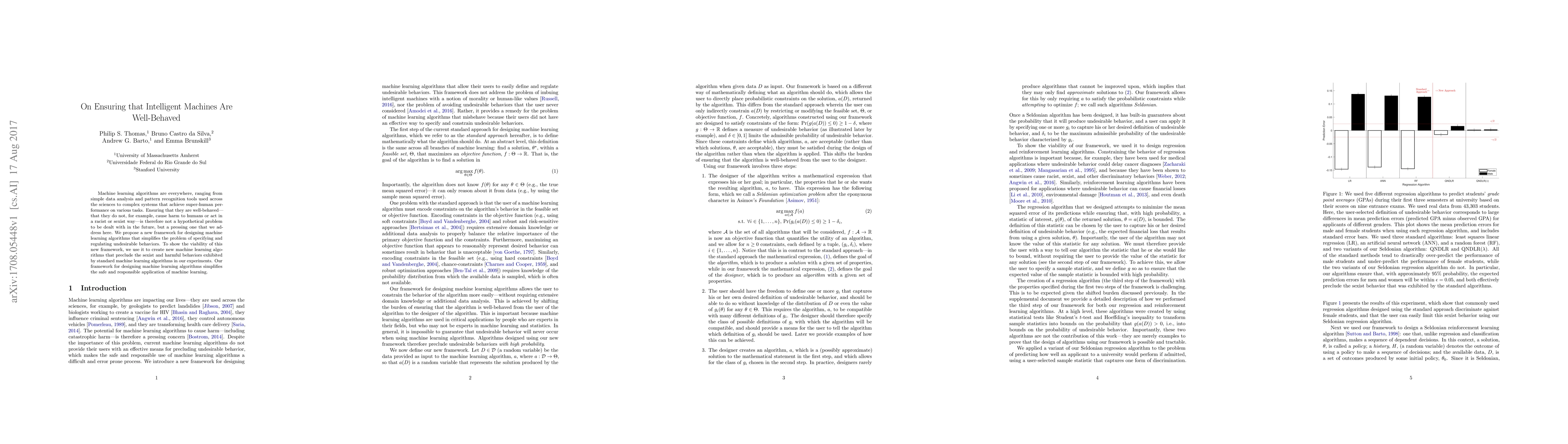 Machine learning algorithms are everywhere, ranging from simple data analysis and pattern recognition tools used across the sciences to complex systems that achieve super-human performance on various tasks. Ensuring that they are well-behaved---that they do not, for example, cause harm to humans or act in a racist or sexist way---is therefore not a hypothetical problem to be dealt with in the future, but a pressing one that we address here. We propose a new framework for designing machine learning algorithms that simplifies the problem of specifying and regulating undesirable behaviors. To show the viability of this new framework, we use it to create new machine learning algorithms that preclude the sexist and harmful behaviors exhibited by standard machine learning algorithms in our experiments. Our framework for designing machine learning algorithms simplifies the safe and responsible application of machine learning.