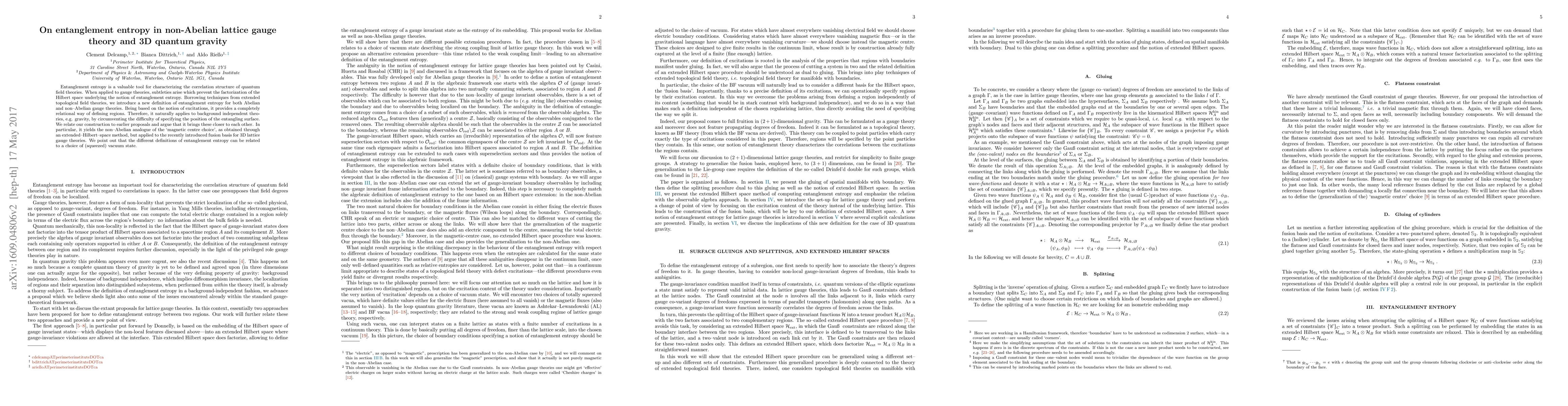This paper introduces a novel definition of entanglement entropy for non-Abelian lattice gauge theories, leveraging techniques from extended topological field theories. It applies this definition to 3D quantum gravity, addressing the challenge of defining regions without specifying entangling surfaces.