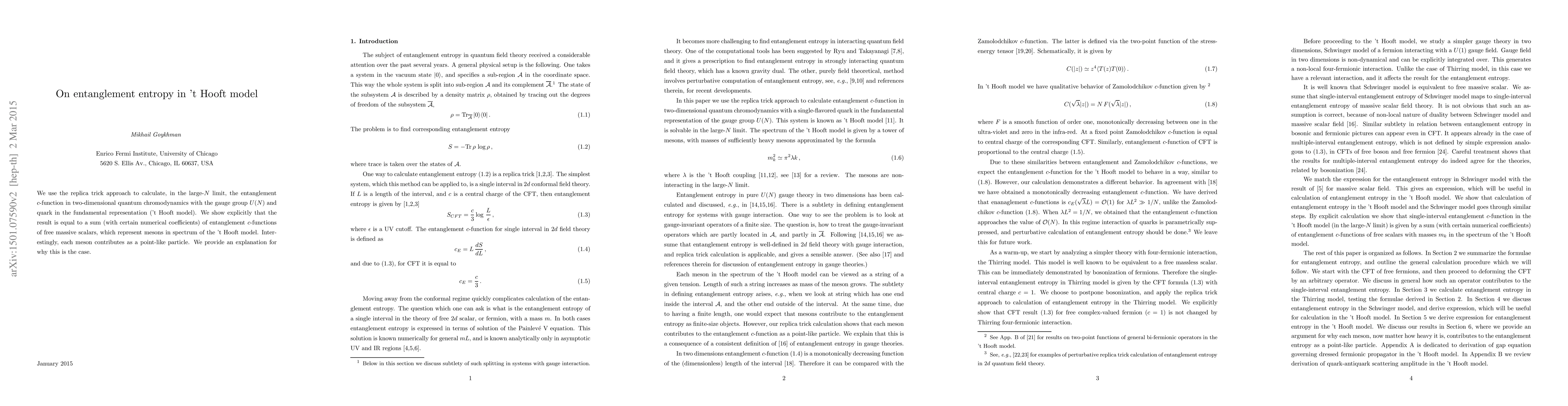 The paper calculates the entanglement c-function in the 't Hooft model using the replica trick, showing it equals a sum of entanglement c-functions of free massive scalars representing mesons, with each meson contributing like a point-like particle. The study provides an explanation for this mesonic contribution.