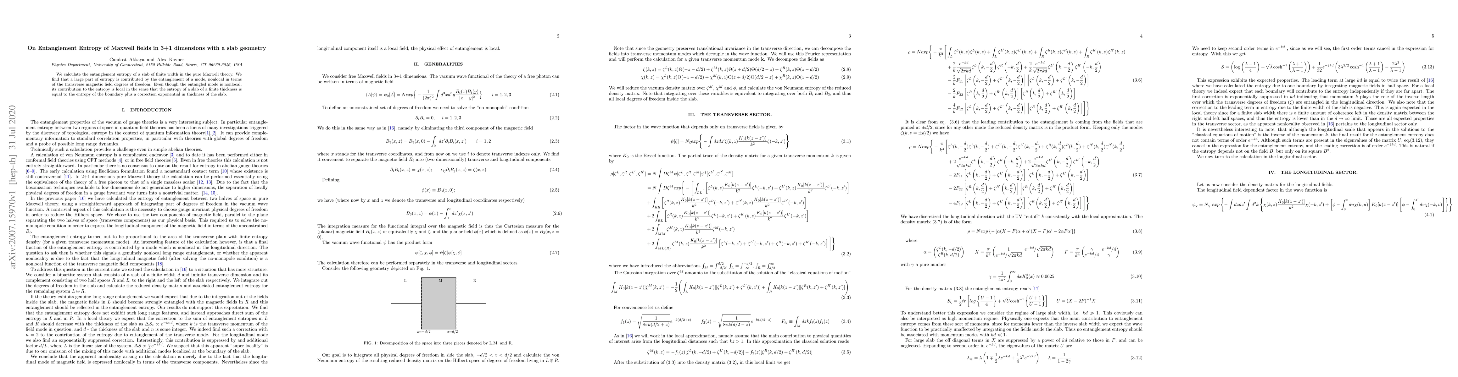 We calculate the entanglement entropy of a slab of finite width in the pure Maxwell theory. We find that a large part of entropy is contributed by the entanglement of a mode, nonlocal in terms of the transverse magnetic field degrees of freedom. Even though the entangled mode is nonlocal, its contribution to the entropy is local in the sense that the entropy of a slab of a finite thickness is equal to the entropy of the boundary plus a correction exponential in thickness of the slab.