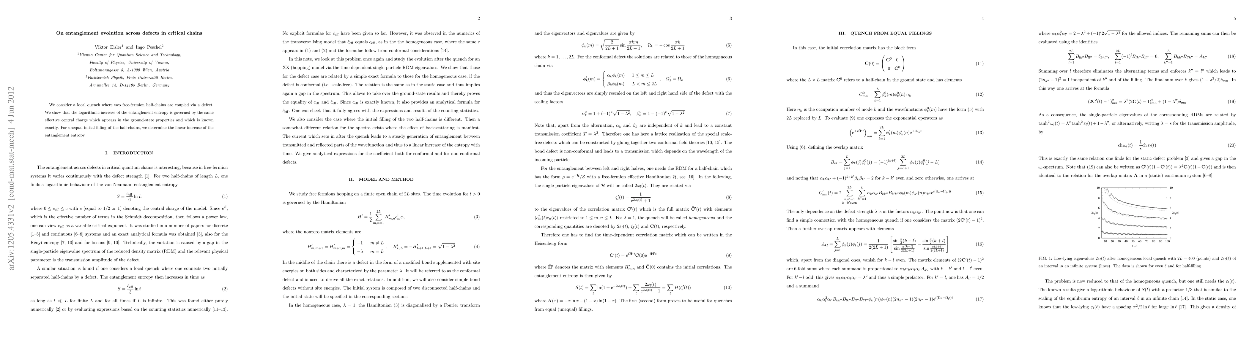 We consider a local quench where two free-fermion half-chains are coupled via a defect. We show that the logarithmic increase of the entanglement entropy is governed by the same effective central charge which appears in the ground-state properties and which is known exactly. For unequal initial filling of the half-chains, we determine the linear increase of the entanglement entropy.