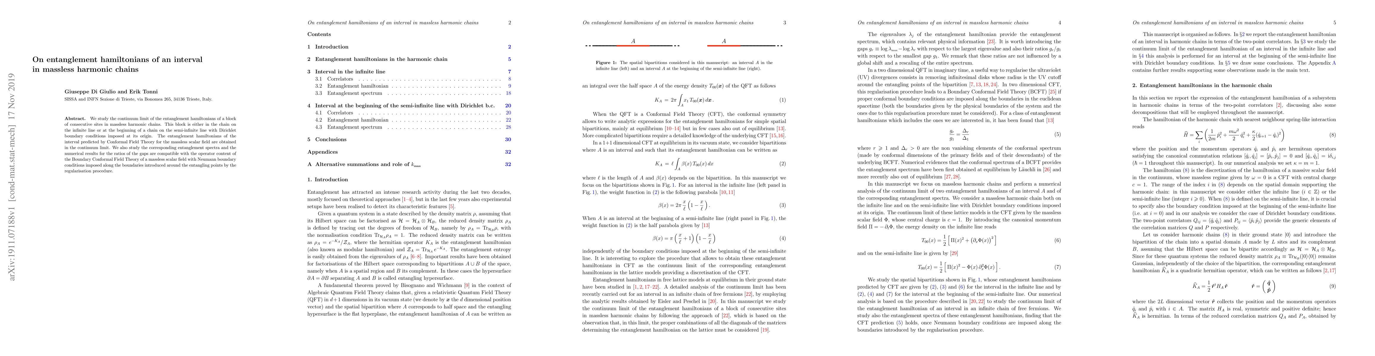 We study the continuum limit of the entanglement hamiltonians of a block of consecutive sites in massless harmonic chains. This block is either in the chain on the infinite line or at the beginning of a chain on the semi-infinite line with Dirichlet boundary conditions imposed at its origin. The entanglement hamiltonians of the interval predicted by Conformal Field Theory for the massless scalar field are obtained in the continuum limit. We also study the corresponding entanglement spectra and the numerical results for the ratios of the gaps are compatible with the operator content of the Boundary Conformal Field Theory of a massless scalar field with Neumann boundary conditions imposed along the boundaries introduced around the entangling points by the regularisation procedure.
