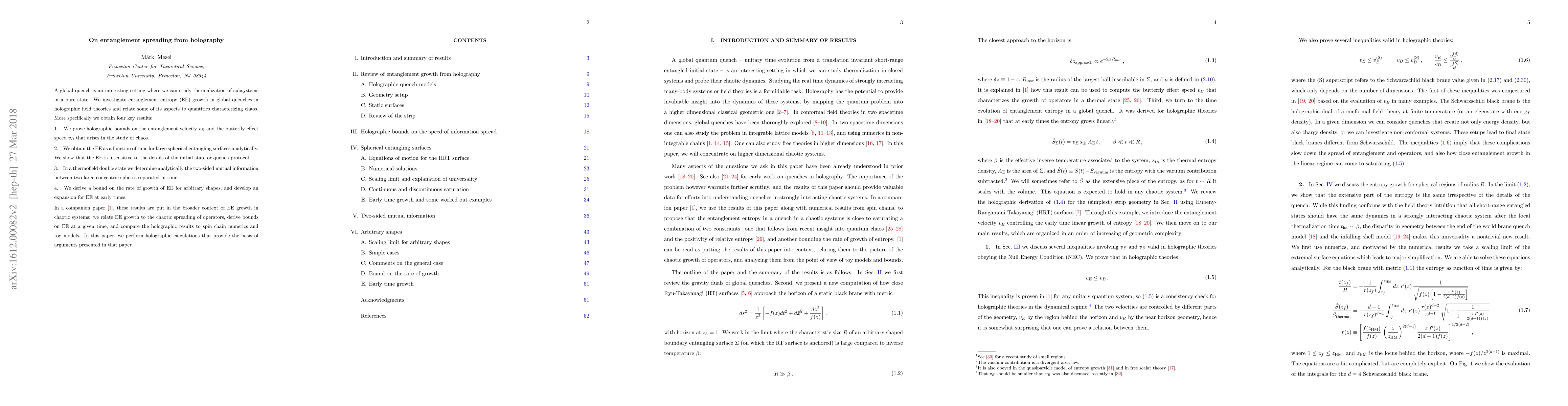 A global quench is an interesting setting where we can study thermalization of subsystems in a pure state. We investigate entanglement entropy (EE) growth in global quenches in holographic field theories and relate some of its aspects to quantities characterizing chaos. More specifically we obtain four key results: 1. We prove holographic bounds on the entanglement velocity $v_E$ and the butterfly effect speed $v_B$ that arises in the study of chaos. 2. We obtain the EE as a function of time for large spherical entangling surfaces analytically. We show that the EE is insensitive to the details of the initial state or quench protocol. 3. In a thermofield double state we determine analytically the two-sided mutual information between two large concentric spheres separated in time. 4. We derive a bound on the rate of growth of EE for arbitrary shapes, and develop an expansion for EE at early times. In a companion paper arXiv:1608.05101, we put these results in the broader context of EE growth in chaotic systems: we relate EE growth to the chaotic spreading of operators, derive bounds on EE at a given time, and compare the holographic results to spin chain numerics and toy models. In this paper, we perform holographic calculations that provide the basis of arguments presented in that paper.
