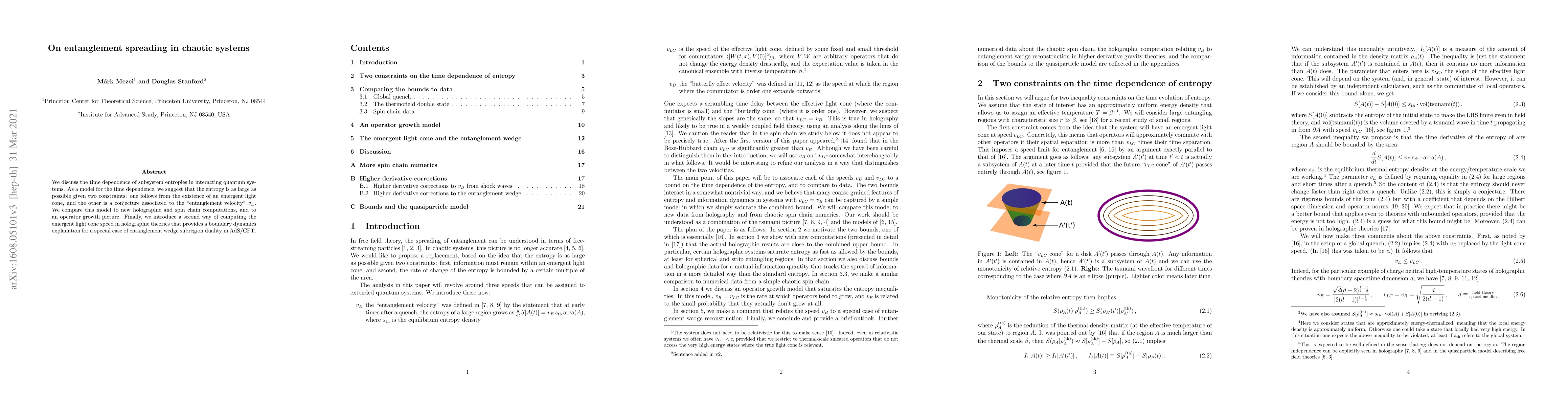 We discuss the time dependence of subsystem entropies in interacting quantum systems. As a model for the time dependence, we suggest that the entropy is as large as possible given two constraints: one follows from the existence of an emergent light cone, and the other is a conjecture associated to the "entanglement velocity" $v_E$. We compare this model to new holographic and spin chain computations, and to an operator growth picture. Finally, we introduce a second way of computing the emergent light cone speed in holographic theories that provides a boundary dynamics explanation for a special case of entanglement wedge subregion duality in AdS/CFT.