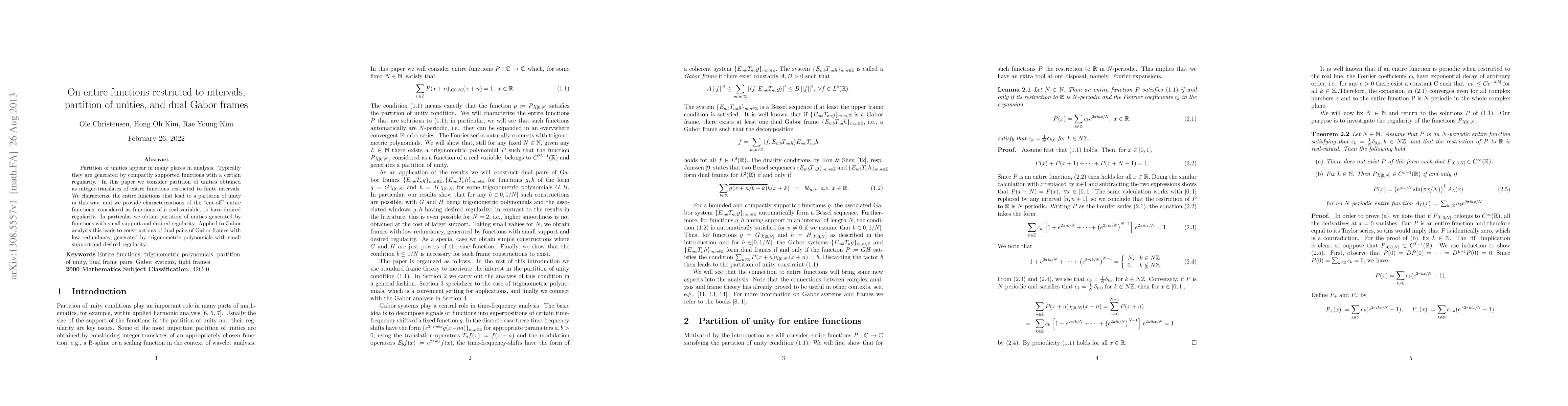 This paper investigates partitions of unity derived from integer-translates of entire functions restricted to finite intervals, characterizing the functions that generate such partitions. It also explores dual Gabor frames with low redundancy constructed using trigonometric polynomials of small support and desired regularity.