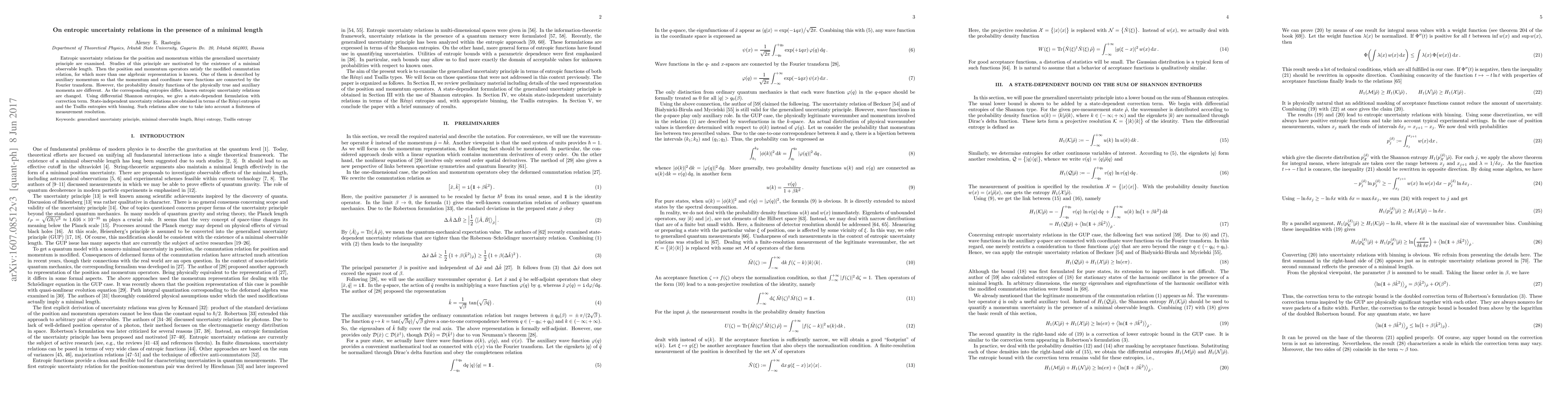 This paper explores entropic uncertainty relations under the generalized uncertainty principle, considering the presence of a minimal observable length. It introduces modified commutation relations and presents state-dependent and state-independent formulations using differential Shannon, Rényi, and Tsallis entropies to account for measurement resolution limitations.