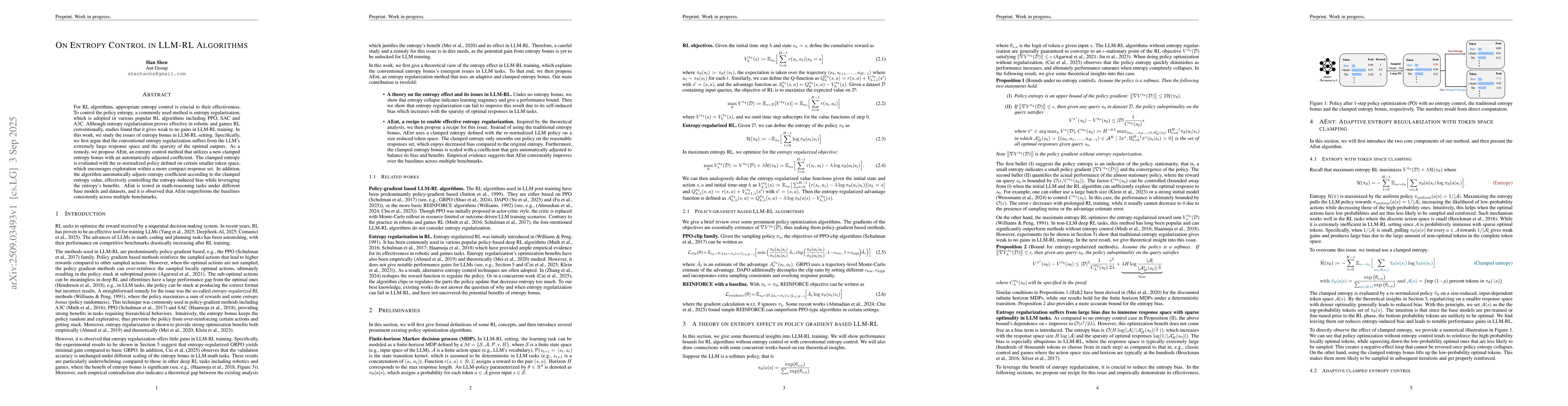 For RL algorithms, appropriate entropy control is crucial to their effectiveness. To control the policy entropy, a commonly used method is entropy regularization, which is adopted in various popular RL algorithms including PPO, SAC and A3C. Although entropy regularization proves effective in robotic and games RL conventionally, studies found that it gives weak to no gains in LLM-RL training. In this work, we study the issues of entropy bonus in LLM-RL setting. Specifically, we first argue that the conventional entropy regularization suffers from the LLM's extremely large response space and the sparsity of the optimal outputs. As a remedy, we propose AEnt, an entropy control method that utilizes a new clamped entropy bonus with an automatically adjusted coefficient. The clamped entropy is evaluated with the re-normalized policy defined on certain smaller token space, which encourages exploration within a more compact response set. In addition, the algorithm automatically adjusts entropy coefficient according to the clamped entropy value, effectively controlling the entropy-induced bias while leveraging the entropy's benefits. AEnt is tested in math-reasoning tasks under different base models and datasets, and it is observed that AEnt outperforms the baselines consistently across multiple benchmarks.
