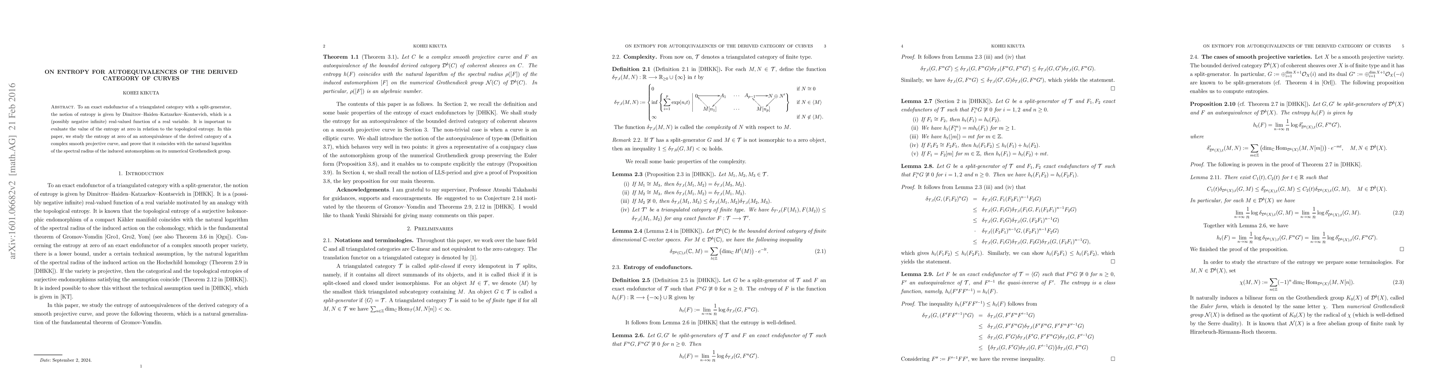 This paper evaluates the entropy at zero for exact autoequivalences of the derived category of complex smooth projective curves, demonstrating that it equals the natural logarithm of the spectral radius of the induced automorphism on the numerical Grothendieck group, linking it to topological entropy.