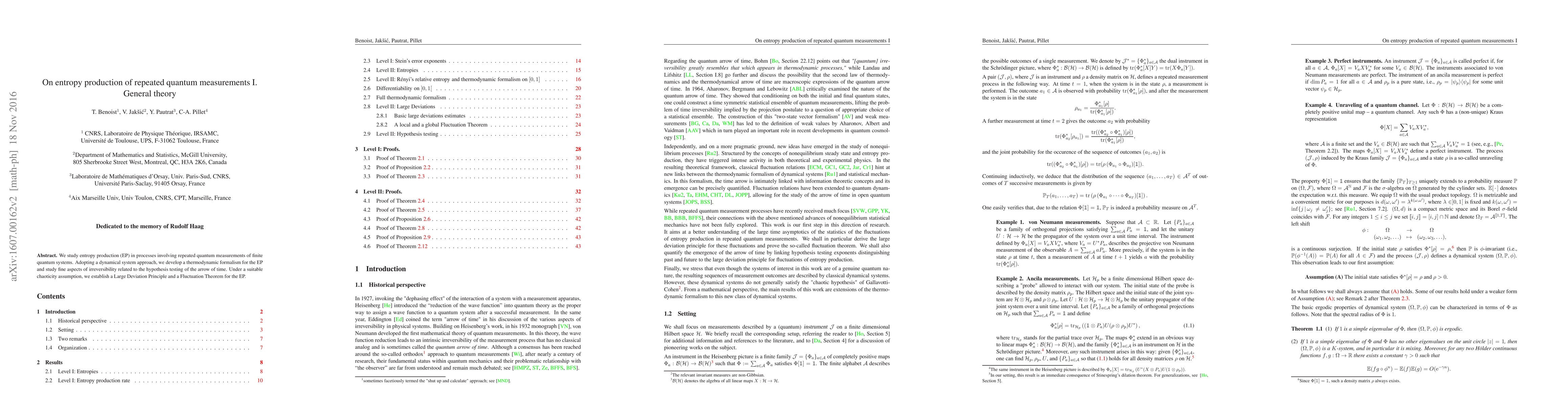 This paper develops a thermodynamic formalism for entropy production in repeated quantum measurements, focusing on irreversibility and the arrow of time. It establishes a Large Deviation Principle and a Fluctuation Theorem under a chaoticity assumption.