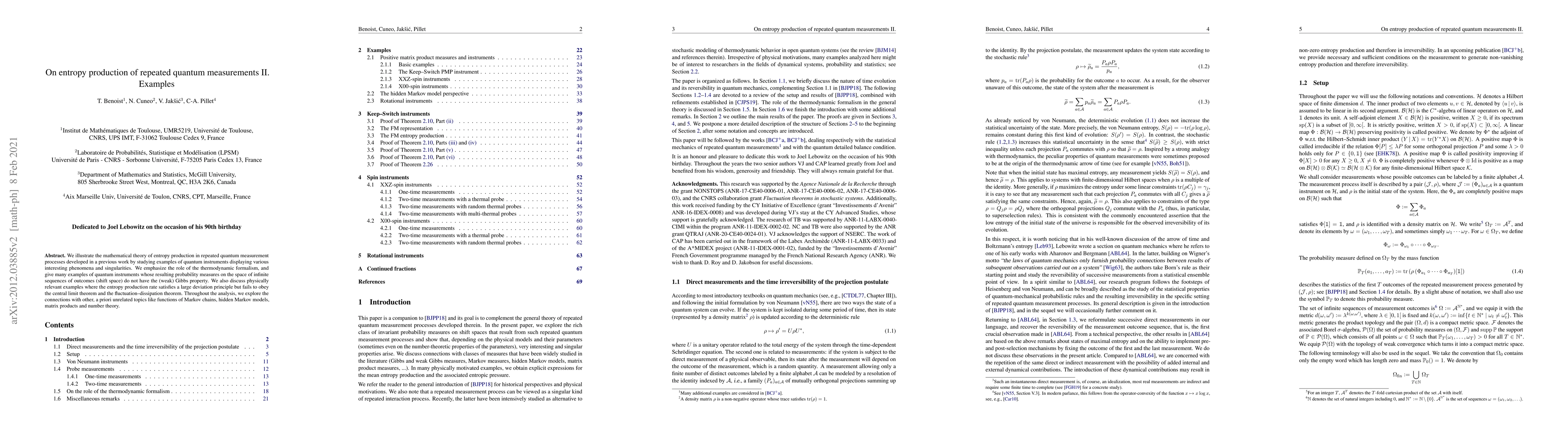 This paper explores entropy production in repeated quantum measurements through various illustrative examples, highlighting phenomena where the resulting probability measures lack the Gibbs property. It also examines cases where entropy production adheres to a large deviation principle but not to the central limit theorem or fluctuation-dissipation theorem, linking these findings to broader mathematical concepts.