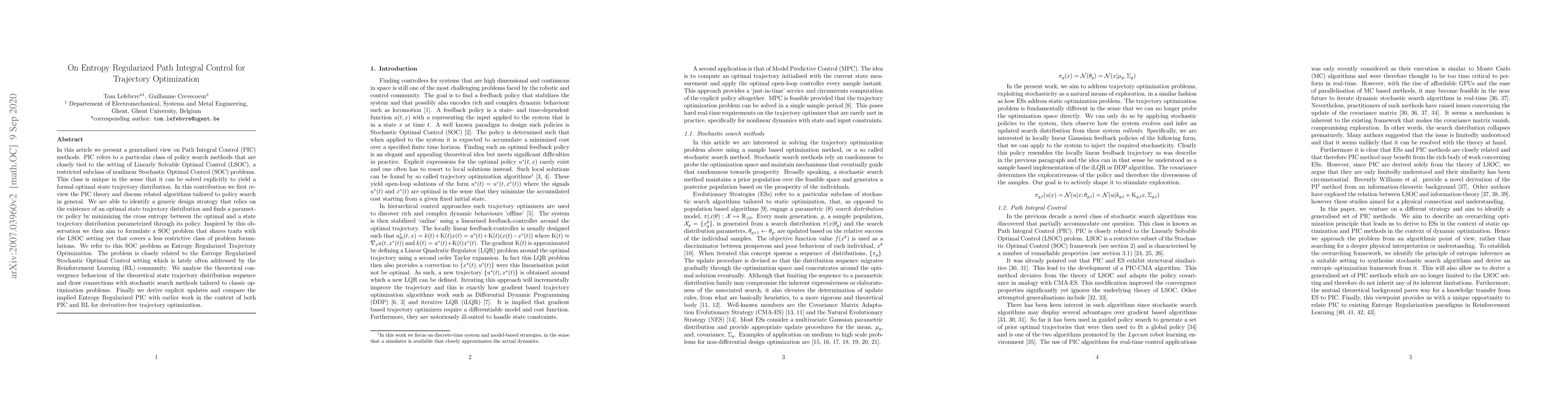 In this article we present a generalised view on Path Integral Control (PIC) methods. PIC refers to a particular class of policy search methods that are closely tied to the setting of Linearly Solvable Optimal Control (LSOC), a restricted subclass of nonlinear Stochastic Optimal Control (SOC) problems. This class is unique in the sense that it can be solved explicitly to yield a formal optimal state trajectory distribution. In this contribution we first review the PIC theory and discuss related algorithms tailored to policy search in general. We are able to identify a generic design strategy that relies on the existence of an optimal state trajectory distribution and finds a parametric policy by minimizing the cross entropy between the optimal and a state trajectory distribution parametrized through its policy. Inspired by this observation we then aim to formulate a SOC problem that shares traits with the LSOC setting yet that covers a less restrictive class of problem formulations. We refer to this SOC problem as Entropy Regularized Trajectory Optimization. The problem is closely related to the Entropy Regularized Stochastic Optimal Control setting which is lately often addressed by the Reinforcement Learning (RL) community. We analyse the theoretical convergence behaviour of the theoretical state trajectory distribution sequence and draw connections with stochastic search methods tailored to classic optimization problems. Finally we derive explicit updates and compare the implied Entropy Regularized PIC with earlier work in the context of both PIC and RL for derivative-free trajectory optimization.