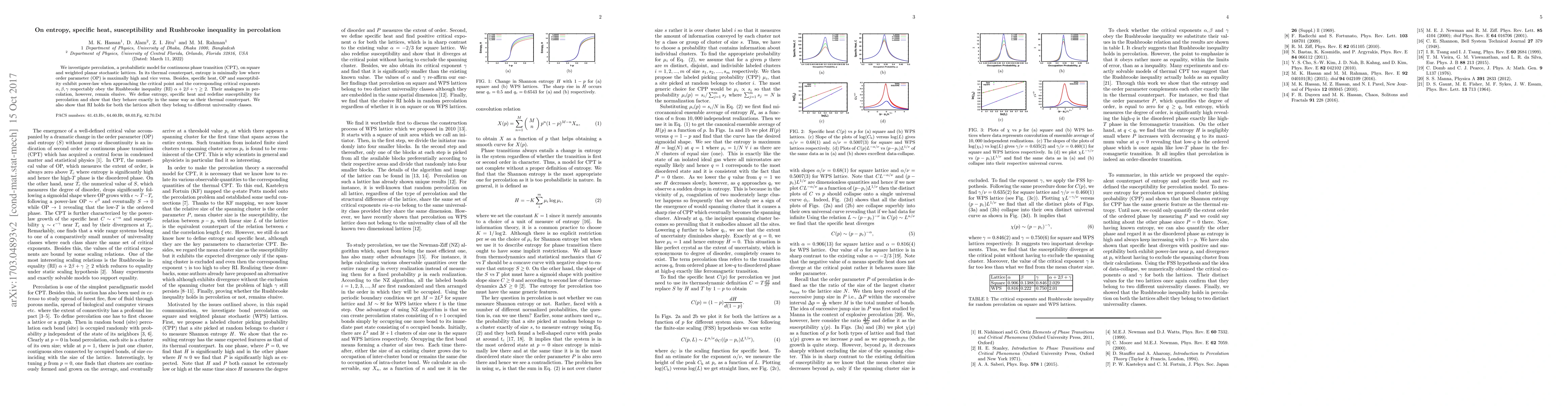 We investigate percolation, a probabilistic model for continuous phase transition (CPT), on square and weighted planar stochastic lattices. In its thermal counterpart, entropy is minimally low where order parameter (OP) is maximally high and vice versa. Besides, specific heat, OP and susceptibility exhibit power-law when approaching the critical point and the corresponding critical exponents $\alpha, \beta, \gamma$ respectably obey the Rushbrooke inequality (RI) $\alpha+2\beta+\gamma\geq 2$. Their analogues in percolation, however, remain elusive. We define entropy, specific heat and redefine susceptibility for percolation and show that they behave exactly in the same way as their thermal counterpart. We also show that RI holds for both the lattices albeit they belong to different universality classes.