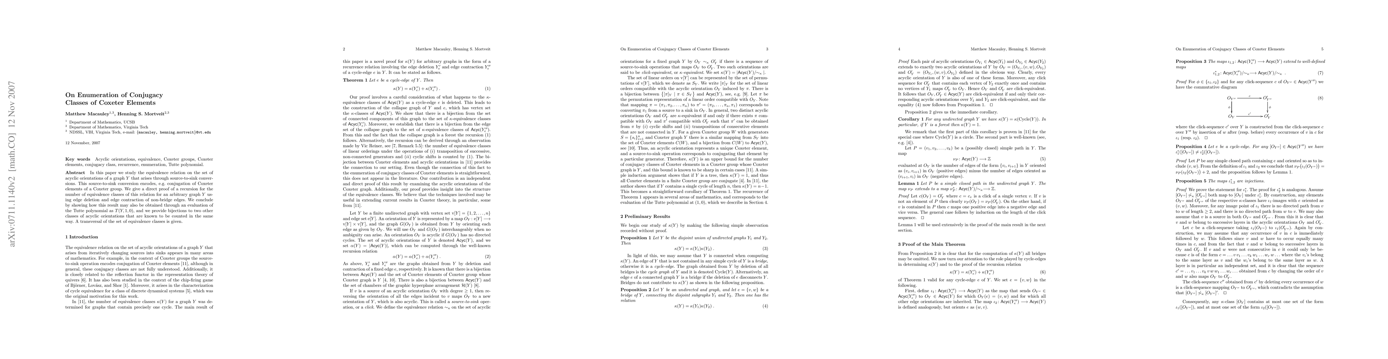 This paper develops a direct proof of a recursion for counting equivalence classes of conjugacy relations in Coxeter groups through edge deletion and contraction, and connects it to the Tutte polynomial and other known classes of acyclic orientations.