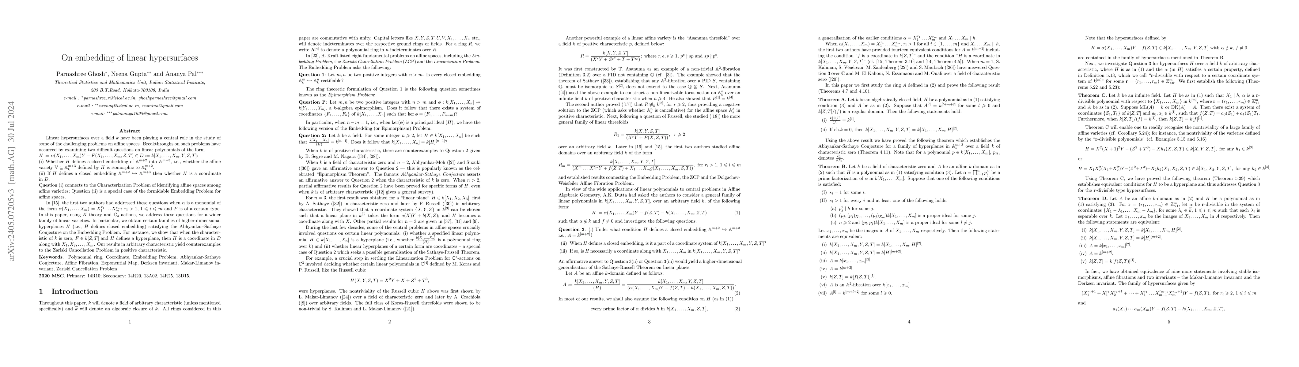 Linear hypersurfaces over a field $k$ have been playing a central role in the study of some of the challenging problems on affine spaces. Breakthroughs on such problems have occurred by examining two questions on linear polynomials of the form\\ $H:=\alpha(X_1,\dots,X_m)Y - F(X_1,\dots, X_m,Z,T)\in D:=k[X_1,\ldots,X_m, Y,Z,T]$: (i) Whether the affine variety $\mathbb{V}\in \mathbb{A}^{m+3}_k$ defined by $H$ is isomorphic to $\mathbb{A}^{m+2}_k$. (ii) If $\mathbb{V}$ is isomorphic to an affine space, then whether $H$ is a coordinate in $D$. In \cite{adv2}, the first two authors had addressed these questions when $\alpha$ is a monomial of the form $\alpha(X_1,\ldots,X_m) = X_1^{r_1}\dots X_m^{r_m}$; $r_i>1,\, 1 \leqslant i \leqslant m$ and $F$ is of a certain type. In this paper, using $K$-theory and $\mathbb{G}_a$-actions, we address these questions for a wider family of linear varieties. In particular, we show that when the characteristic of $k$ is zero, $F \in k[Z,T]$ and $H$ defines a hyperplane (i.e., the affine variety $\mathbb{V}$ defined by $H$ is an affine space), then $H$ is a coordinate in $D$ along with $X_1, X_2, \dots, X_m$. As a consequence we obtain a certain families of higher dimensional linear hyperplanes satisfying the Abhyankar-Sathaye conjecture on the Epimorphism Problem. Our results in arbitrary characteristic yield counter examples to the Zariski Cancellation Problem in positive characteristic.