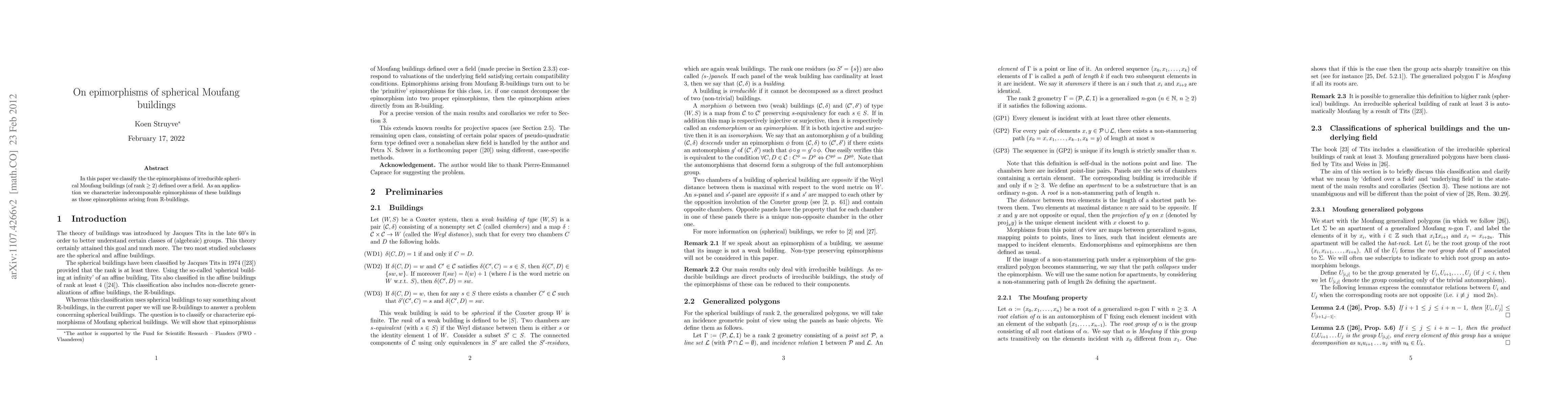This paper classifies the epimorphisms of irreducible spherical Moufang buildings of rank at least 2 over a field, identifying indecomposable epimorphisms as those originating from R-buildings.