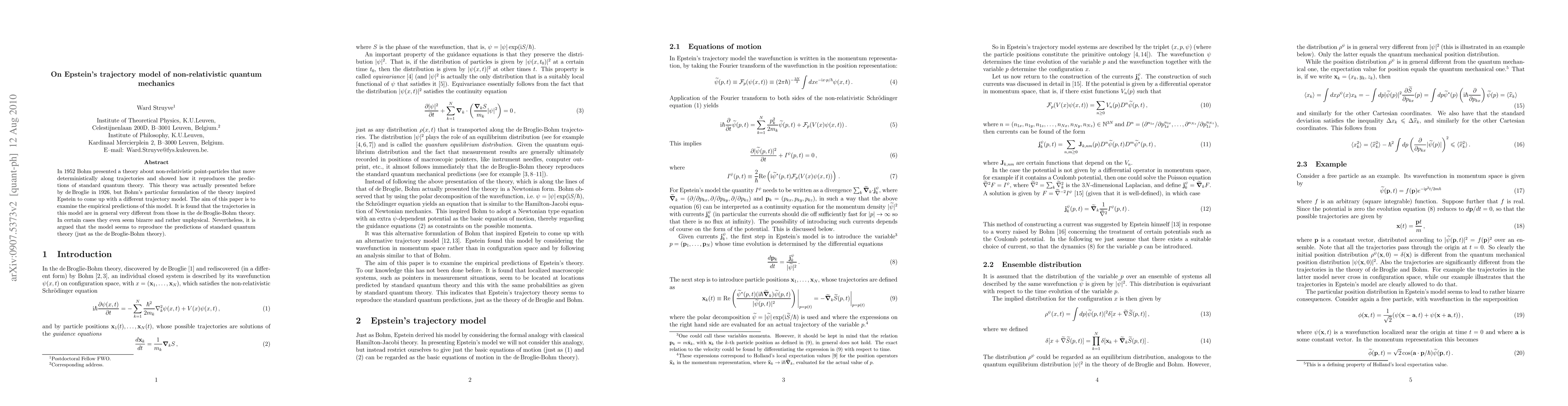This paper investigates Epstein's trajectory model of non-relativistic quantum mechanics, which diverges from the de Broglie-Bohm theory in its predicted particle paths. Despite its unusual trajectories, the model is found to reproduce the predictions of standard quantum theory.