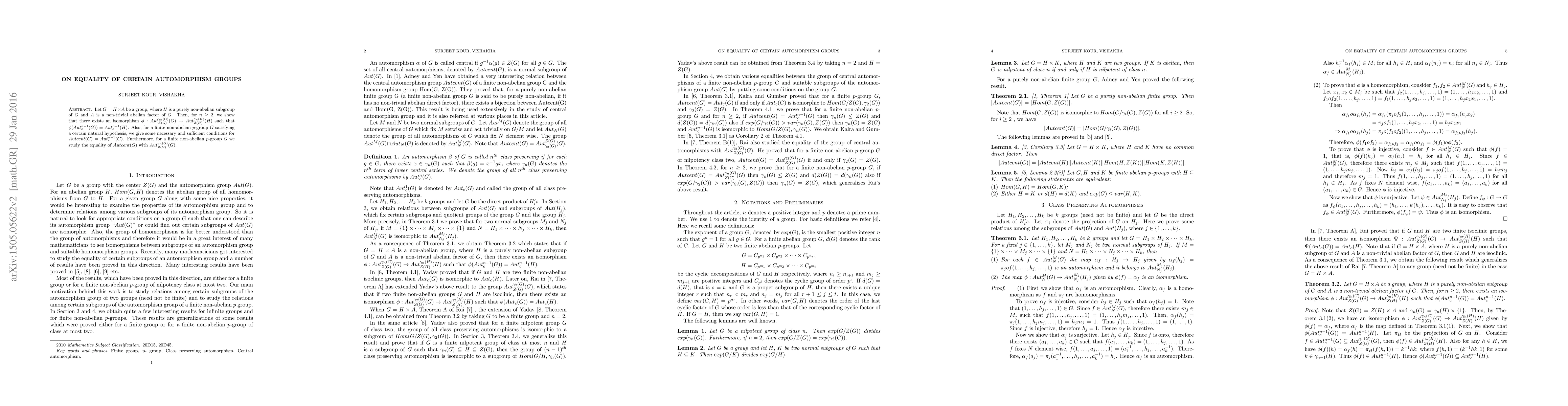 Let $G = H\times A$ be a group, where $H$ is a purely non-abelian subgroup of $G$ and $A$ is a non-trivial abelian factor of $G$. Then, for $n \geq 2$, we show that there exists an isomorphism $\phi : Aut_{Z(G)}^{\gamma_{n}(G)}(G) \rightarrow Aut_{Z(H)}^{\gamma_{n}(H)}(H)$ such that $\phi(Aut_{c}^{n-1}(G))=Aut_{c}^{n-1}(H)$. Also, for a finite non-abelian $p$-group $G$ satisfying a certain natural hypothesis, we give some necessary and sufficient conditions for $Autcent(G) = Aut_c^{n-1}(G)$. Furthermore, for a finite non-abelian $p$-group $G$ we study the equality of $Autcent(G)$ with $Aut_{Z(G)}^{\gamma_{n}(G)}(G)$.