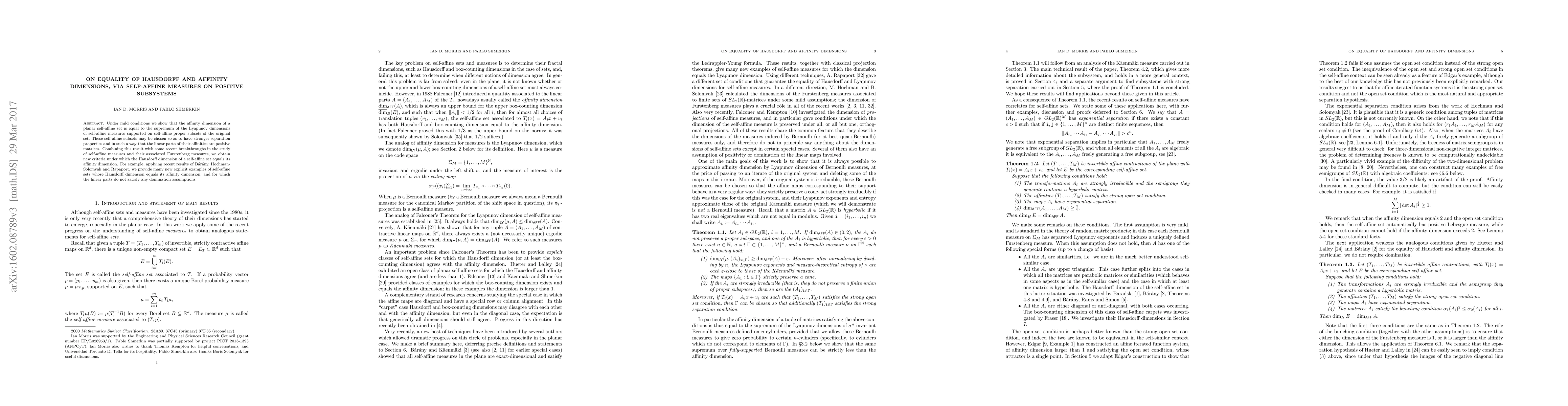 This paper demonstrates that the affinity dimension of a planar self-affine set matches the supremum of the Lyapunov dimensions of self-affine measures on its positive subsystems. It also provides new criteria for the equality of Hausdorff and affinity dimensions, offering explicit examples without domination assumptions.