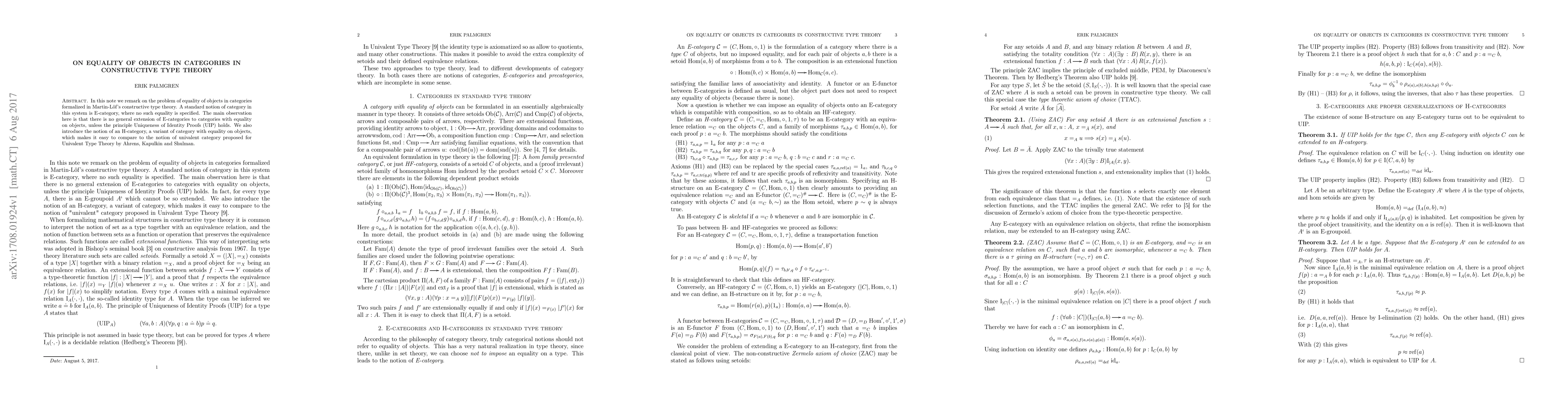 This paper discusses the challenge of defining equality of objects in categories within Martin-Löf's constructive type theory, specifically noting that E-categories lack such equality. It concludes that extending E-categories to include object equality requires the Uniqueness of Identity Proofs (UIP) and introduces H-categories as a variant for easier comparison with univalent categories.