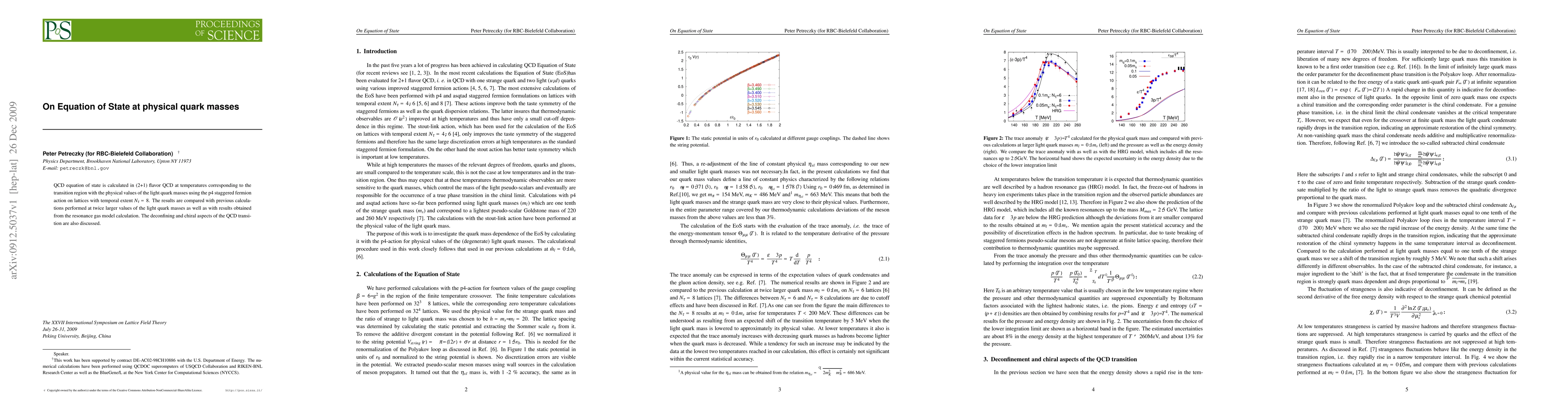 QCD equation of state is calculated in (2+1) flavor QCD at temperatures corresponding fermion action on lattices with temporal extent $N_{\tau}=8$. The results are compared with previous calculations performed at twice larger values of the light quark masses as well as with results obtained from the resonance gas model calculation. The deconfining and chiral aspects of the QCD transition are also discussed