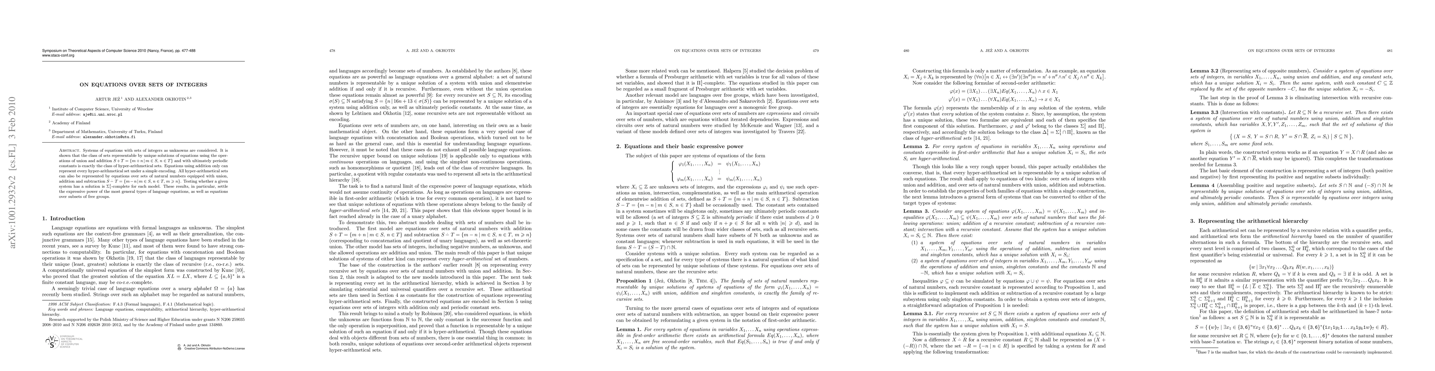 Research shows that equations over sets of integers can represent hyper-arithmetical sets, which are exactly solvable using union and addition operations. This discovery settles the expressive power of certain language equations and subsets of free groups.