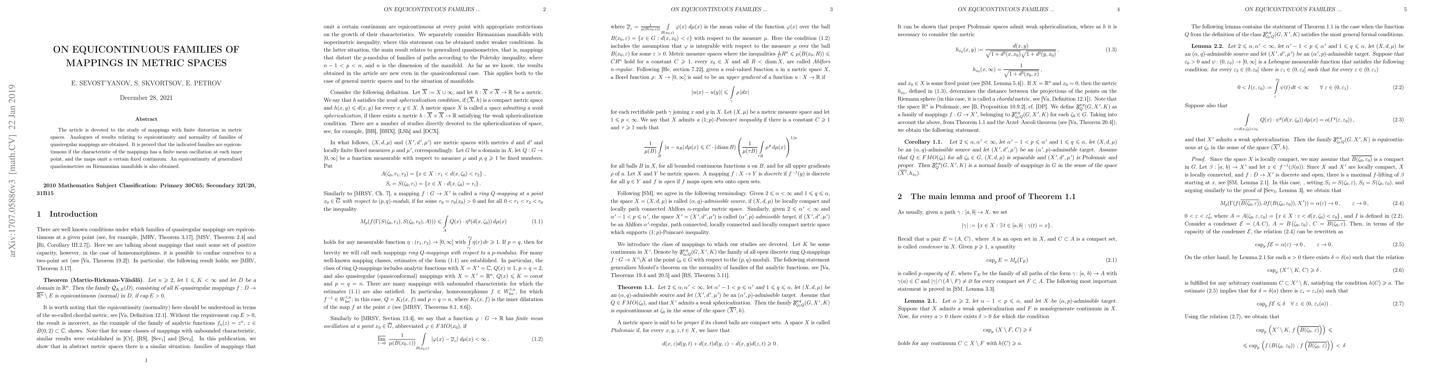 This paper investigates mappings with finite distortion in metric spaces, proving that families of such mappings are equicontinuous if they have finite mean oscillation characteristics and omit a fixed continuum. It also establishes equicontinuity for generalized quasiisometries on Riemannian manifolds.