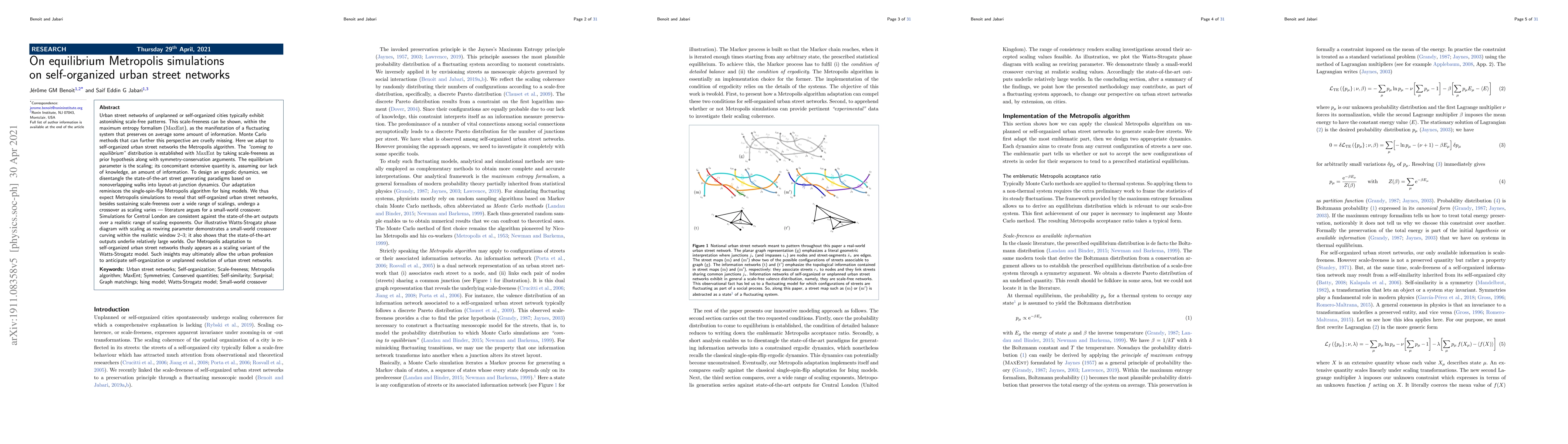 This paper adapts the Metropolis algorithm to simulate equilibrium in self-organized urban street networks, revealing a small-world crossover as scaling varies. The simulations show consistency with state-of-the-art outputs and suggest that urban street networks may anticipate self-organization through scale-freeness and information-preserving dynamics.
