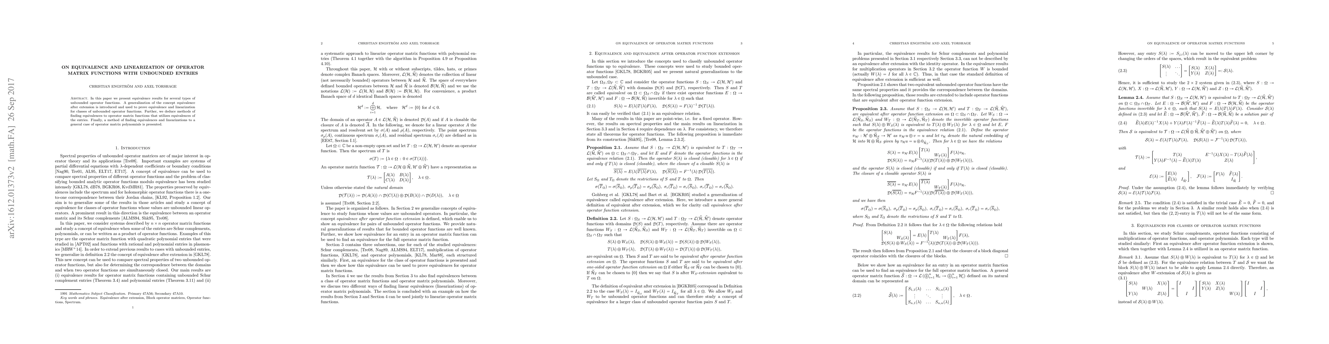 In this paper we present equivalence results for several types of unbounded operator functions. A generalization of the concept equivalence after extension is introduced and used to prove equivalence and linearization for classes of unbounded operator functions. Further, we deduce methods of finding equivalences to operator matrix functions that utilizes equivalences of the entries. Finally, a method of finding equivalences and linearizations to a general case of operator matrix polynomials is presented.