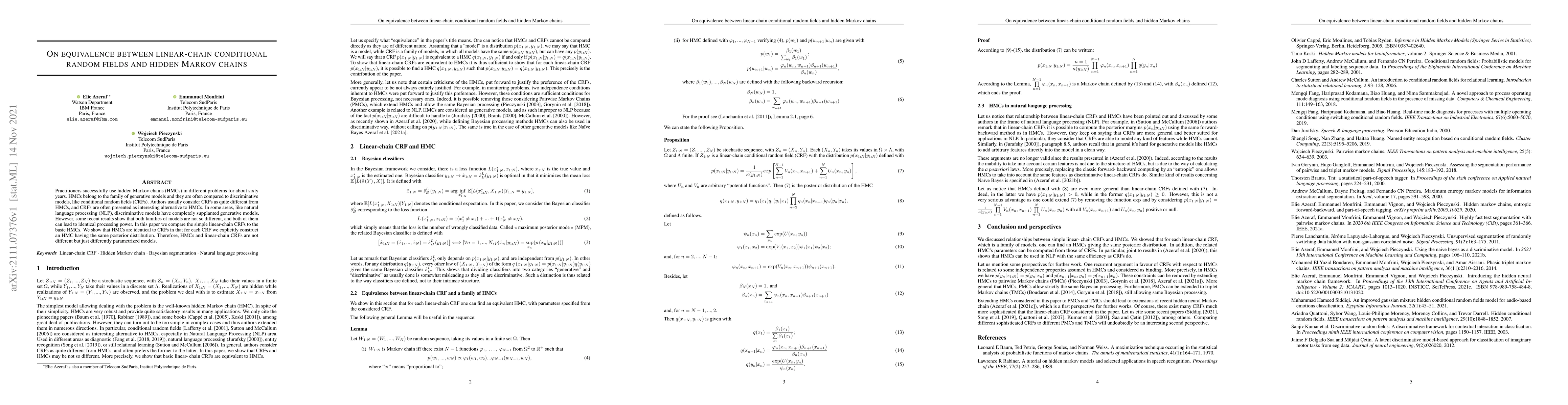 Researchers show that linear-chain conditional random fields (CRFs) and basic hidden Markov chains (HMCs) can produce identical results, with HMCs being a differently parametrized version of CRFs.