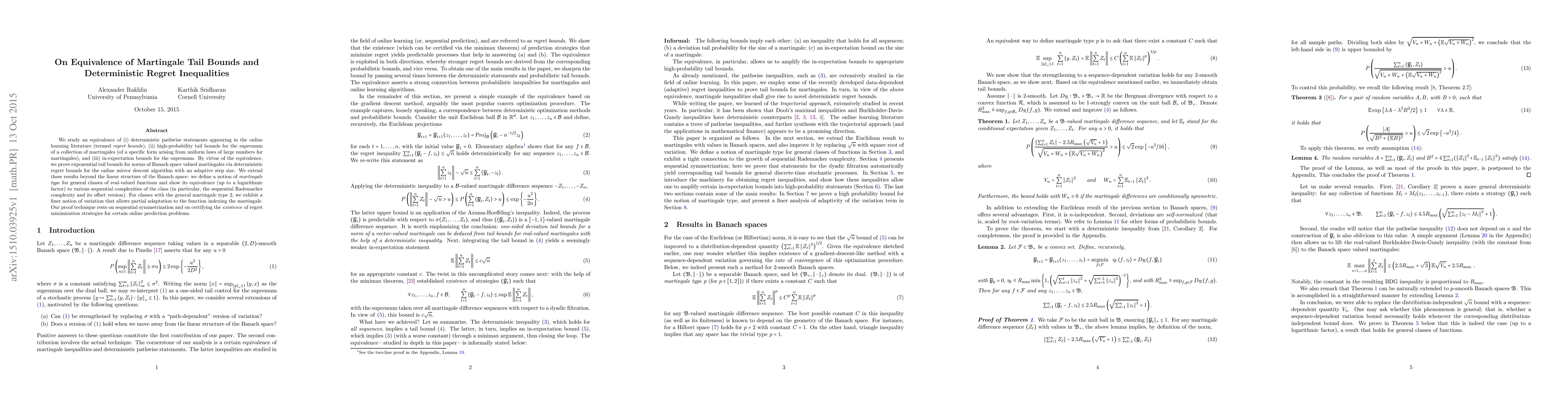 This paper establishes an equivalence between regret bounds in online learning, high-probability tail bounds for martingales, and in-expectation bounds for their supremum. It leverages this equivalence to derive exponential tail bounds for Banach space valued martingales and extends these results to general classes of real-valued functions, defining a notion of martingale type and linking it to sequential complexities.