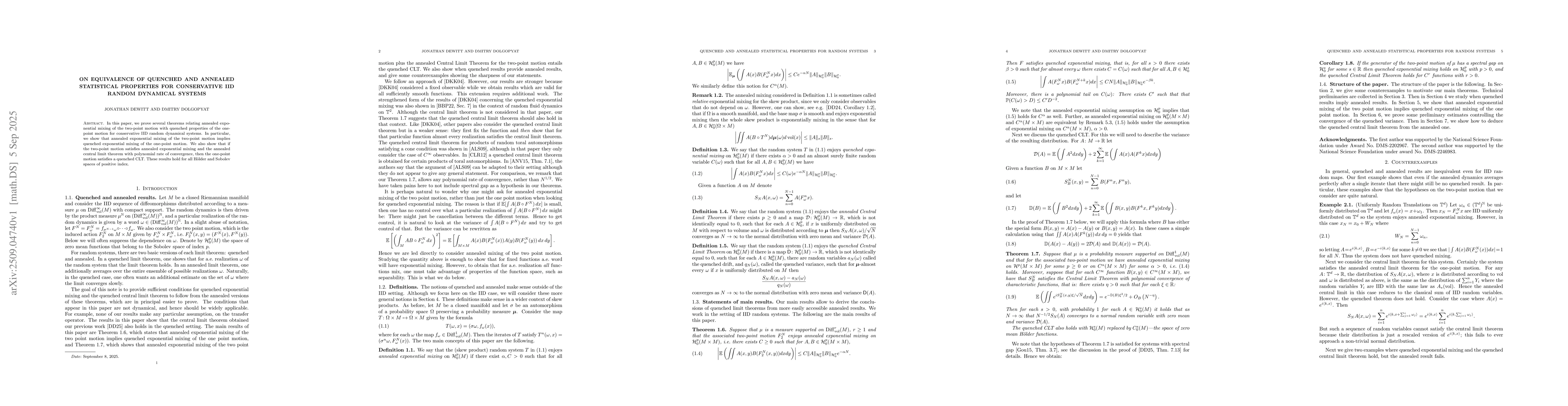 In this paper, we prove several theorems relating annealed exponential mixing of the two-point motion with quenched properties of the one-point motion for conservative IID random dynamical systems. In particular, we show that annealed exponential mixing of the two-point motion implies quenched exponential mixing of the one-point motion. We also show that if the two-point motion satisfies annealed exponential mixing and the annealed central limit theorem with polynomial rate of convergence, then the one-point motion satisfies a quenched CLT. These results hold for all H\"older and Sobolev spaces of positive index.