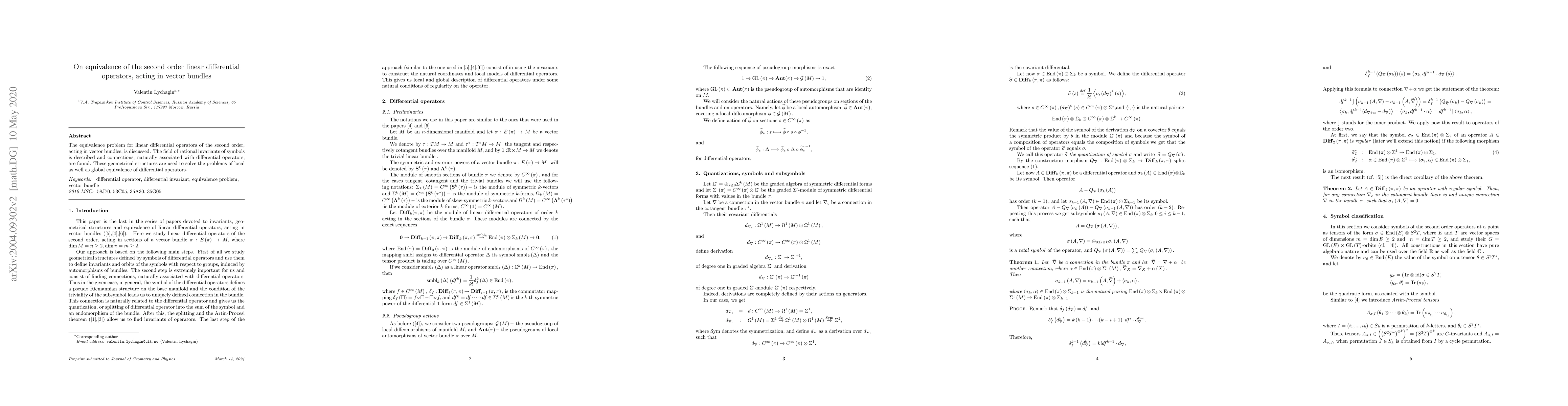 This paper investigates the equivalence of second-order linear differential operators in vector bundles, describing the field of rational invariants of their symbols and identifying associated connections. It uses these geometrical structures to address both local and global equivalence problems of the operators.
