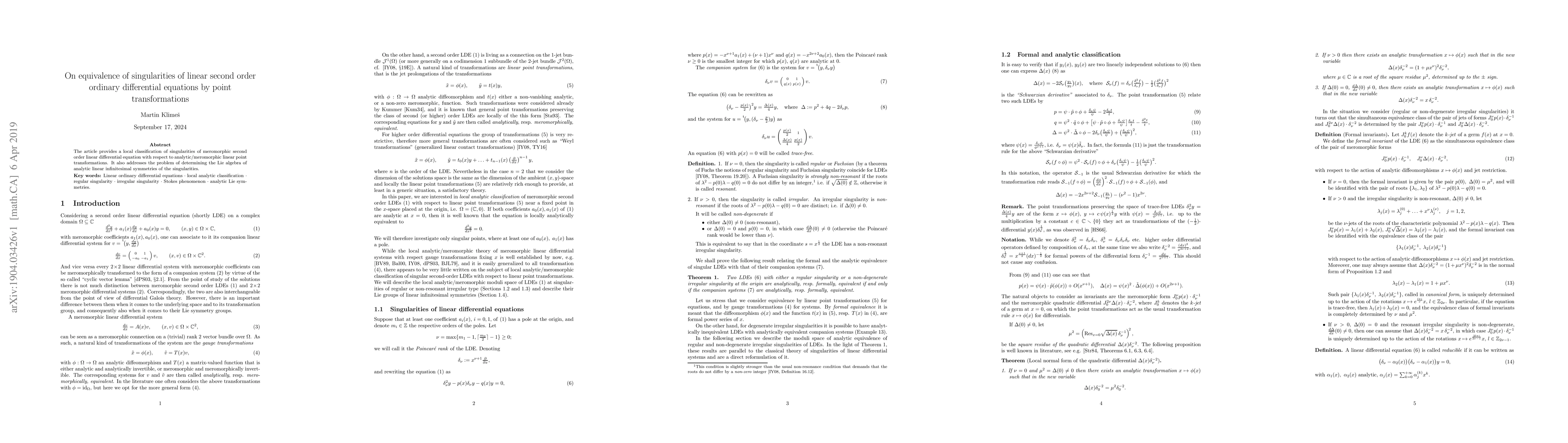 The paper classifies singularities of meromorphic second-order linear differential equations via analytic/meromorphic point transformations and determines the corresponding Lie algebra of infinitesimal symmetries.