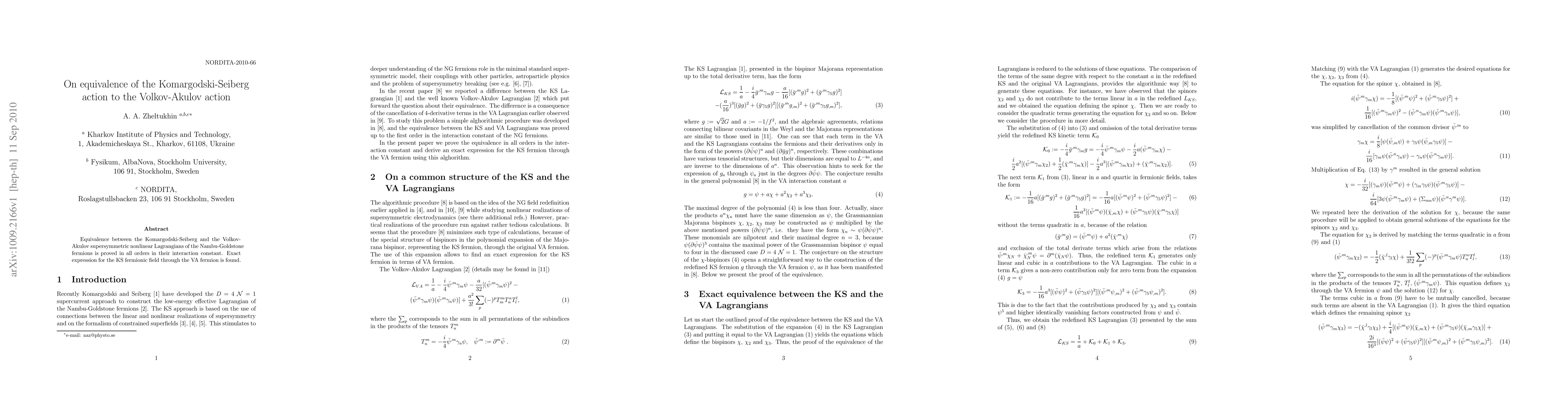 This paper proves the equivalence of the Komargodski-Seiberg and Volkov-Akulov supersymmetric nonlinear Lagrangians for Nambu-Goldstone fermions, demonstrating the exact relationship between the KS fermionic field and the VA fermion across all interaction orders.