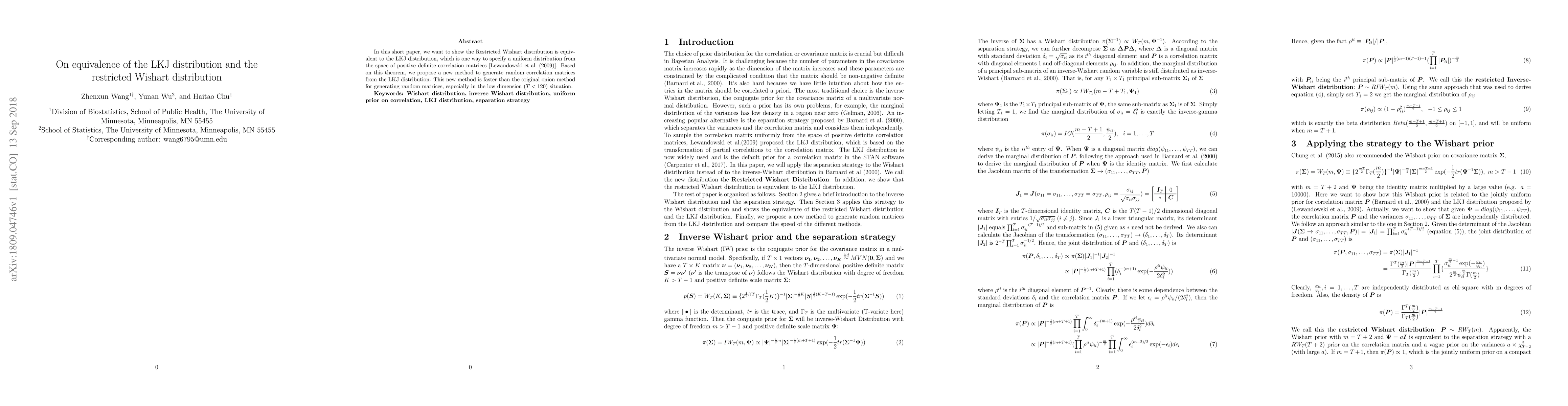 This paper demonstrates the equivalence between the Restricted Wishart distribution and the LKJ distribution for positive definite correlation matrices. It proposes a new, faster method for generating random correlation matrices from the LKJ distribution, particularly effective for dimensions less than 120.