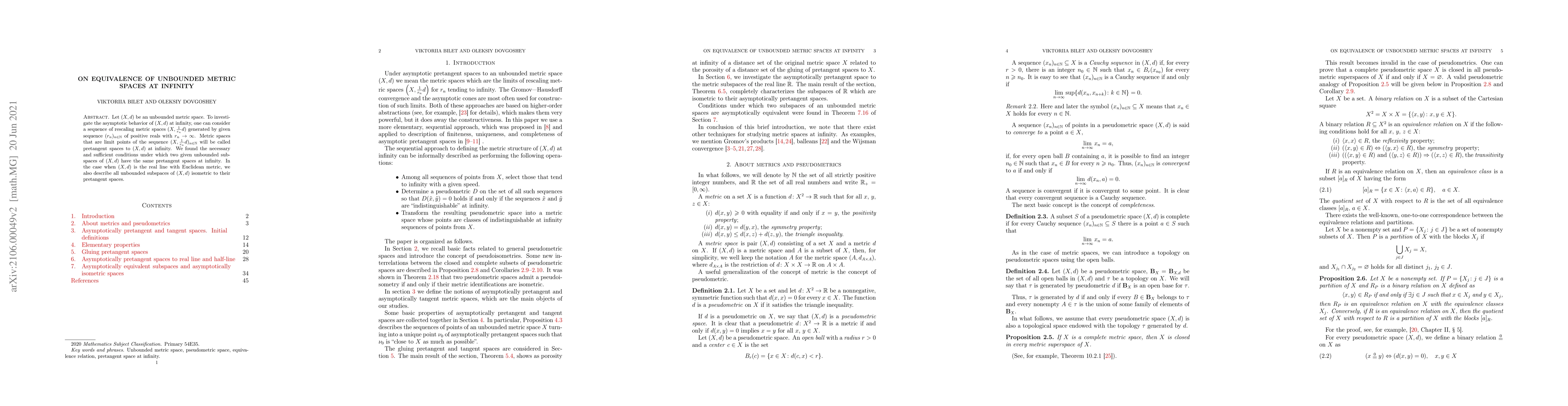This paper investigates the equivalence of unbounded metric spaces at infinity by defining pretangent spaces through rescaling sequences. It establishes necessary and sufficient conditions for two unbounded metric subspaces to share the same pretangent spaces at infinity, and provides a complete description for the real line with Euclidean metric.