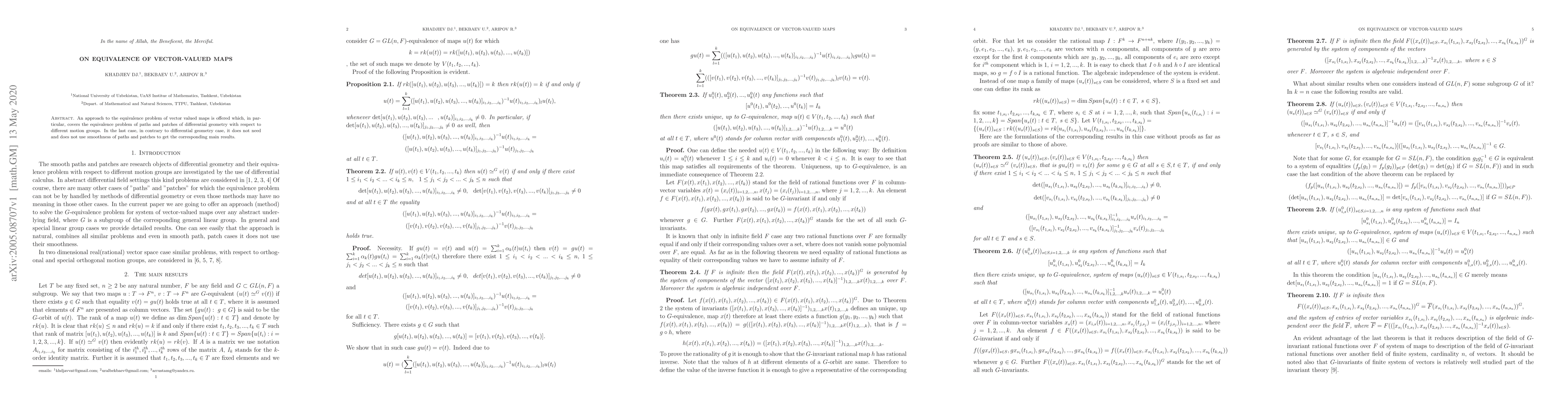An approach to the equivalence problem of vector valued maps is offered which, in particular, covers the equivalence problem of paths and patches of differential geometry with respect to different motion groups. In the last case, in contrary to differential geometry case, it does not need and does not use smoothness of paths and patches to get the corresponding main results.