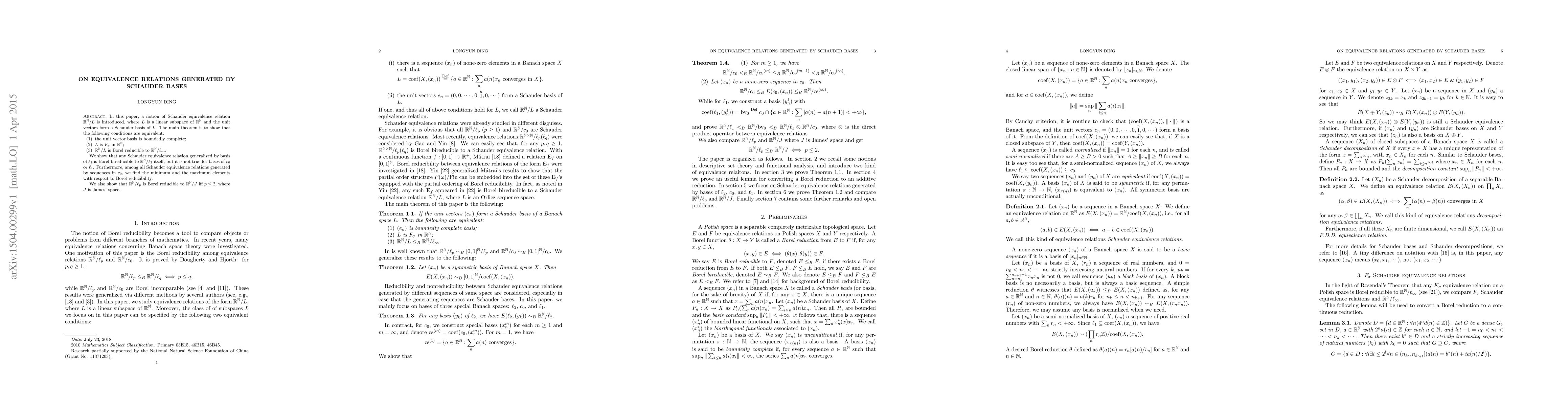 This paper introduces Schauder equivalence relations generated by Schauder bases and proves that certain conditions are equivalent, including bounded completeness, $F_\sigma$ properties, and Borel reducibility. It demonstrates that $\mathbb{R}^\mathbb{N}/\ell_2$ is Borel bireducible to itself but not for $\ell_1$ or $c_0$, and identifies the minimum and maximum elements among Schauder equivalence relations in $c_0$ with respect to Borel reducibility.