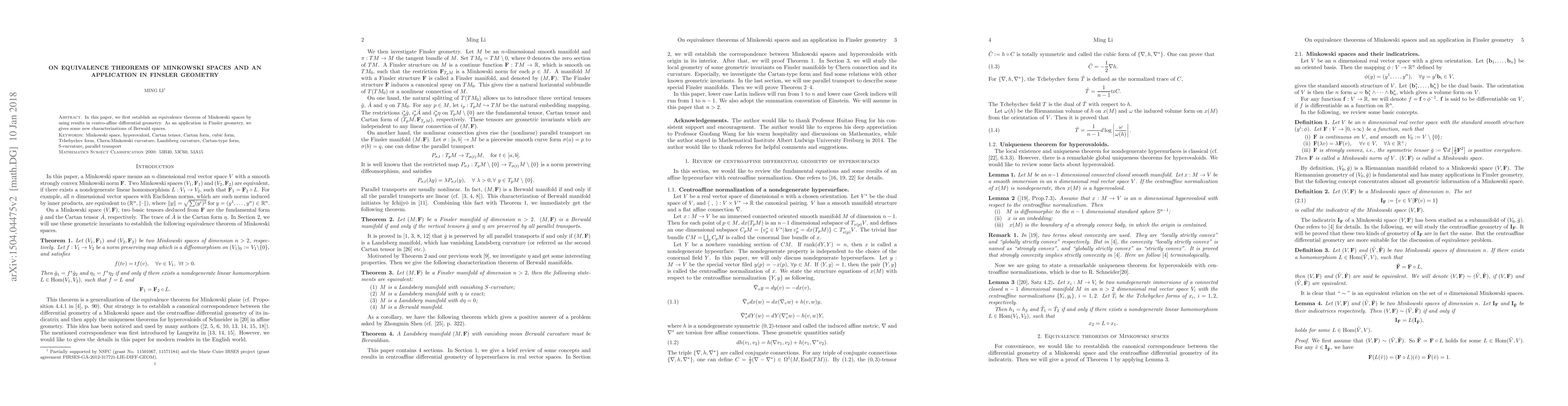 This paper establishes an equivalence theorem for Minkowski spaces using centro-affine differential geometry and applies it to provide new characterizations of Berwald spaces in Finsler geometry.