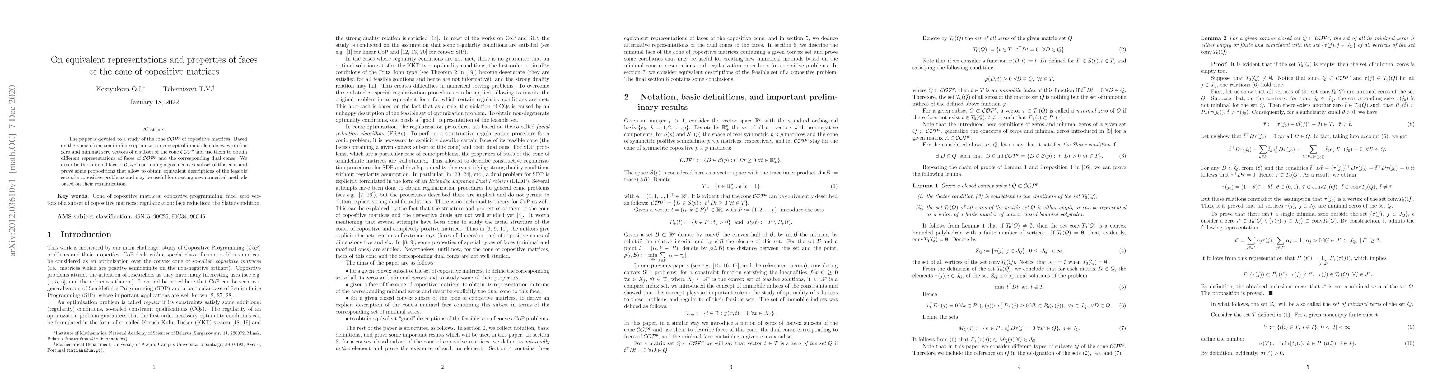 The paper explores the cone $\cop$ of copositive matrices, defining zero and minimal zero vectors to represent its faces and dual cones. It provides equivalent descriptions of feasible sets for copositive problems, potentially aiding in the development of new regularization-based numerical methods.