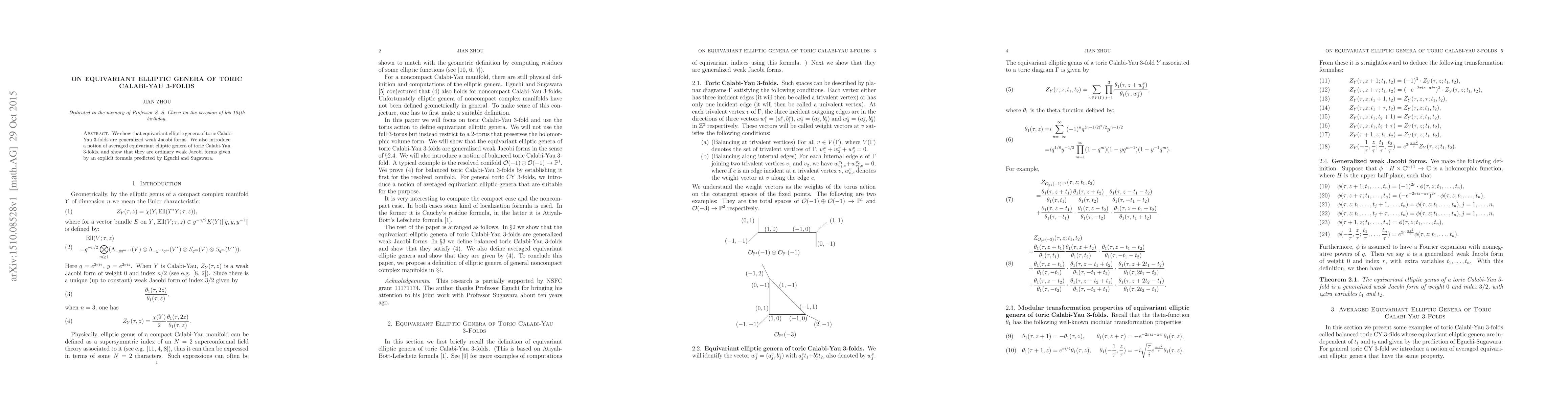 This paper demonstrates that equivariant elliptic genera of toric Calabi-Yau 3-folds are generalized weak Jacobi forms and introduces averaged equivariant elliptic genera, proving they are ordinary weak Jacobi forms via an explicit formula from Eguchi and Sugawara.