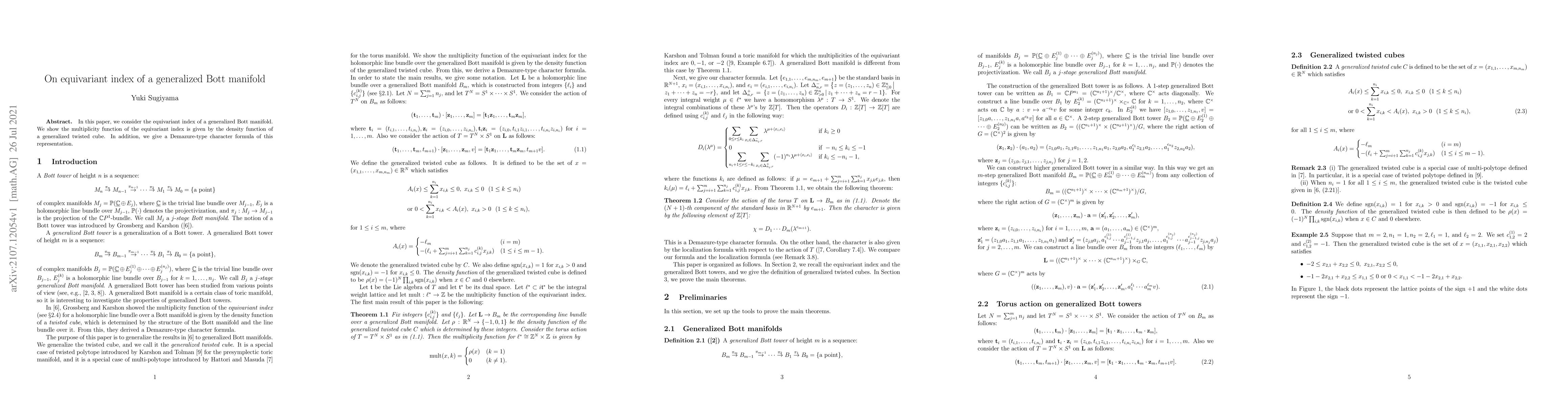 This paper investigates the equivariant index of a generalized Bott manifold, demonstrating that its multiplicity function corresponds to the density function of a generalized twisted cube. It also provides a Demazure-type character formula for the associated representation.