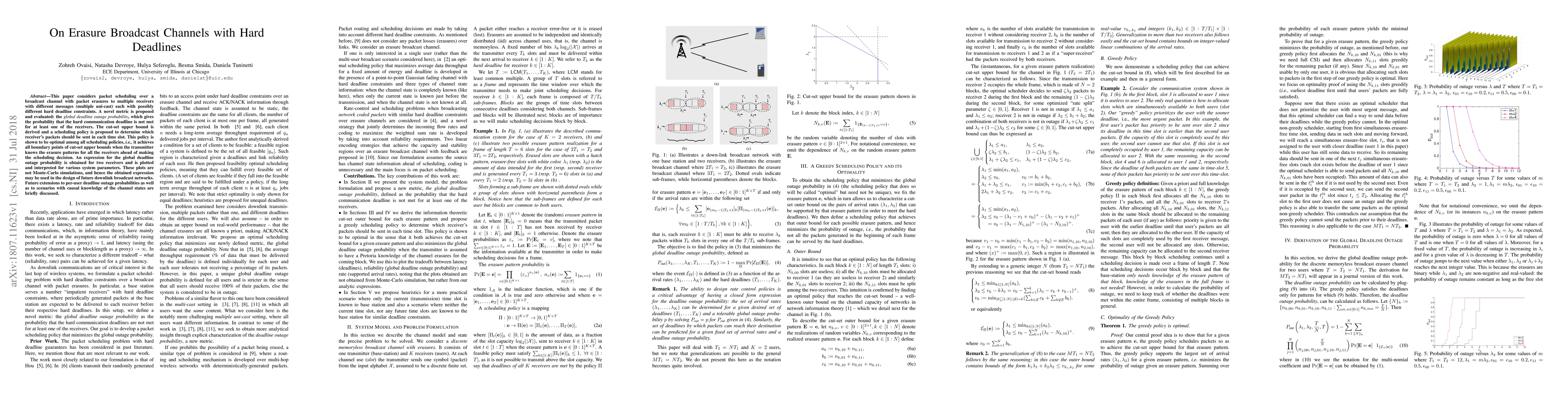 This paper proposes a scheduling policy for packet transmission over a broadcast channel with packet erasures and hard deadlines, introducing a global deadline outage probability metric. It derives a cut-set upper bound and demonstrates the optimality of the proposed scheduling policy under full knowledge of erasure patterns.