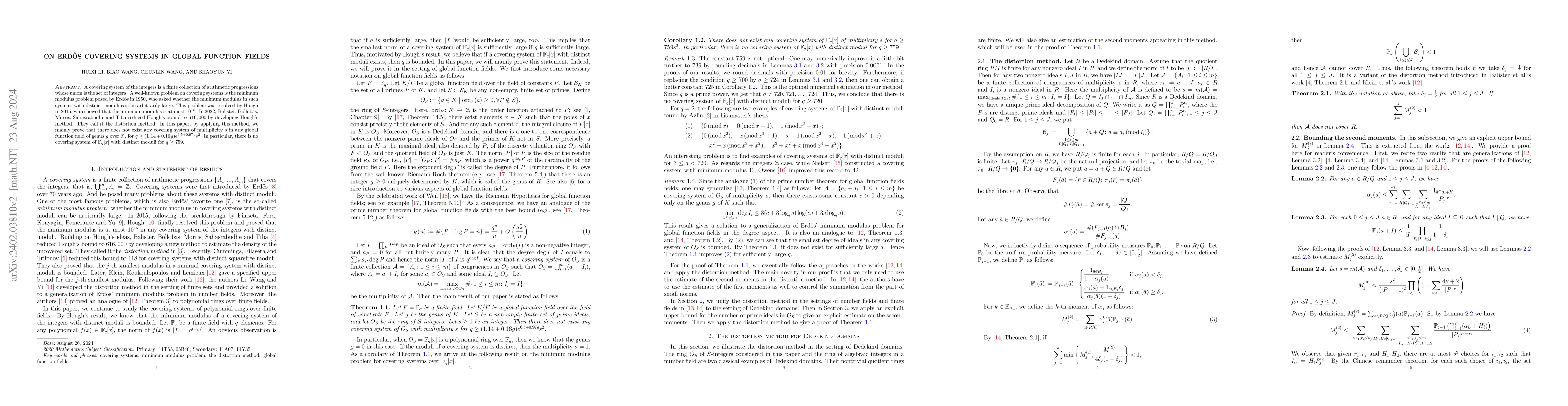 This paper applies the distortion method to prove that no covering system of multiplicity $s$ exists in global function fields of genus $g$ over $\mathbb{F}_q$ for $q\geq (1.14+0.16g)e^{6.5+0.97g}s^2$. Specifically, it shows there is no covering system of $\mathbb{F}_q[x]$ with distinct moduli for $q\geq 759$.